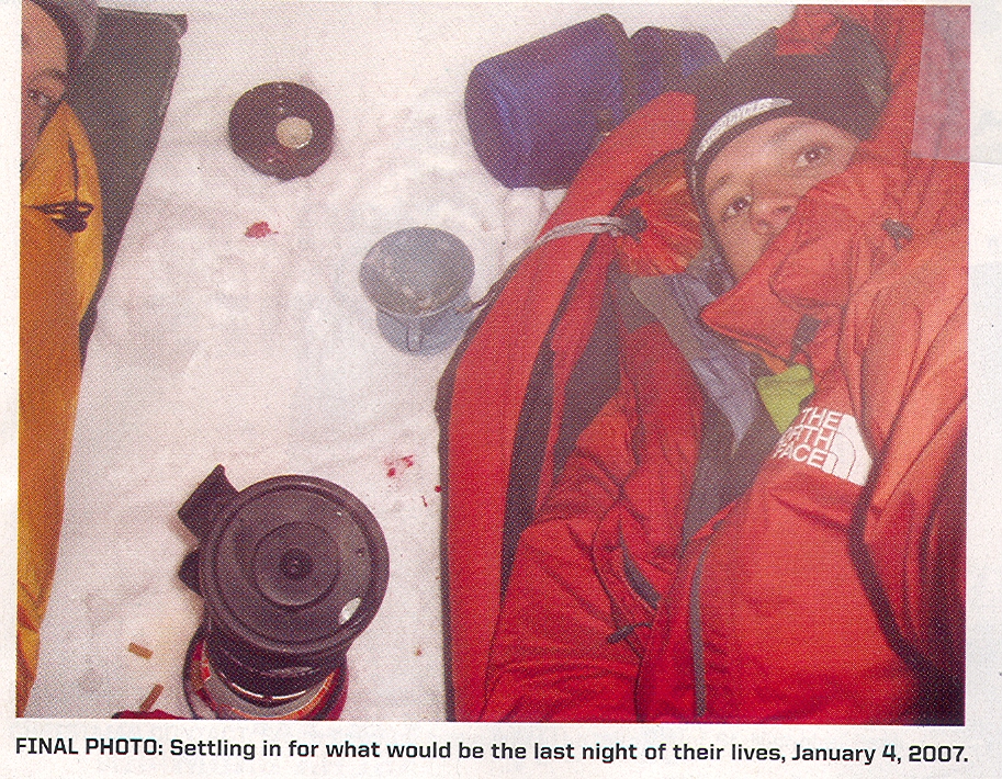 На фотографиях, друг-друга, которые они сделали внутри, видно как они разместились в своем маленьком гроте, улыбаясь на фоне вырубленных белых стен, и снаряги уложенной у изголовья. Прямо перед ними – небольшая горелка, которую они зажгли, чтобы расплавить снег и разогреть ужин. Абсолютно понятно, в этот момент им оставалось жить всего лишь несколько часов.