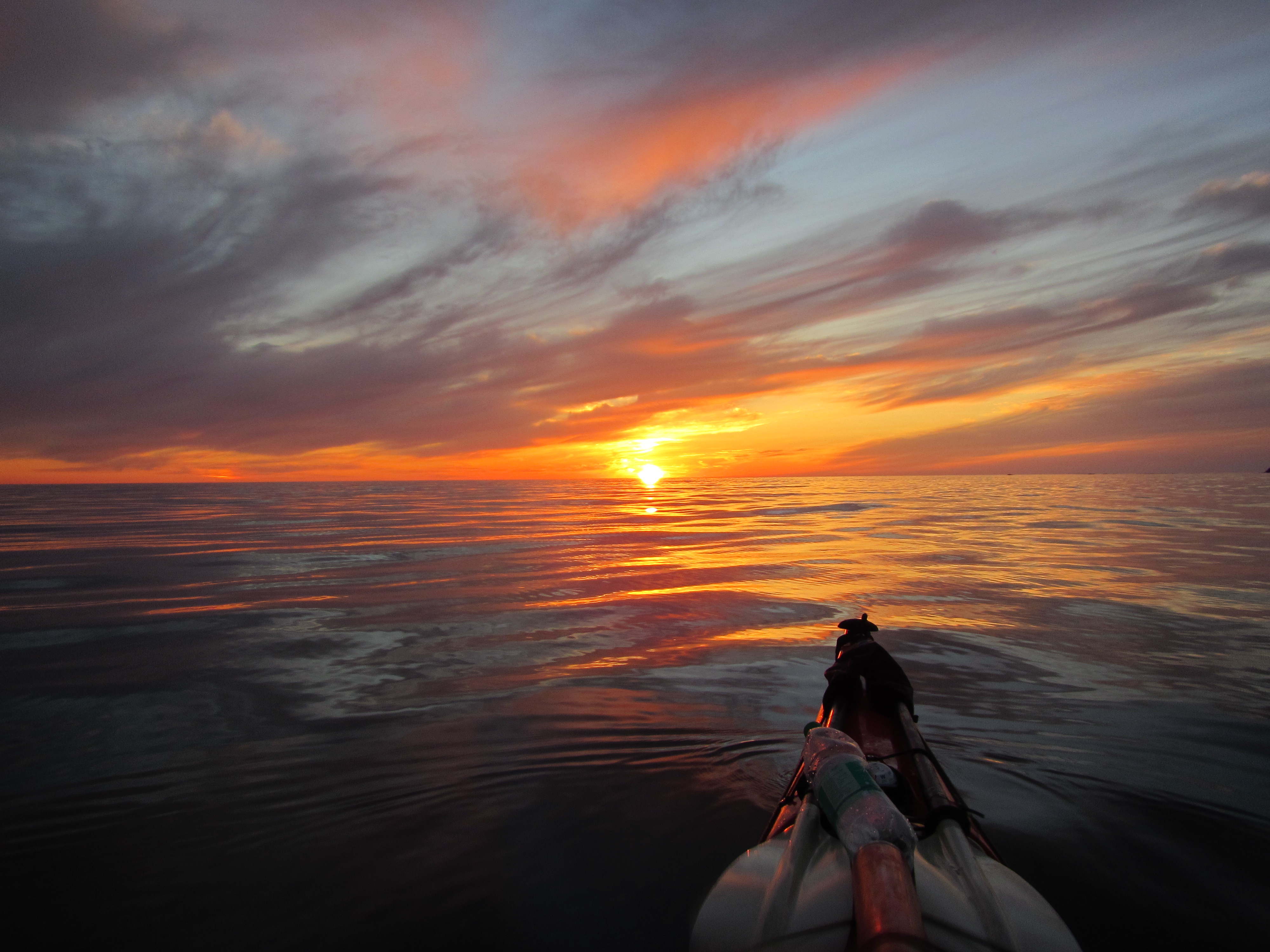 День на исходе, и солнце зависает над самым горизонтом. И тут, в течение 10 минут, случается один из самых грандиознейших закатов, который я когда-либо видел. Нет, конечно, закатами, меня, выросшего на западном побережье, особо не удивишь. Но обычно закат наблюдаешь либо с суши, либо с волнующегося моря, и краски и вся красота, как бы, сверху. Но сегодня, мы на воде, фактически в воде, абсолютно спокойной, напоминающей зеркало. И мы, практически часть этого зеркала, полностью погружены в это буйство багрянца, синевы, золота и пурпура! Фотография не передаст всей полноты, но все же…