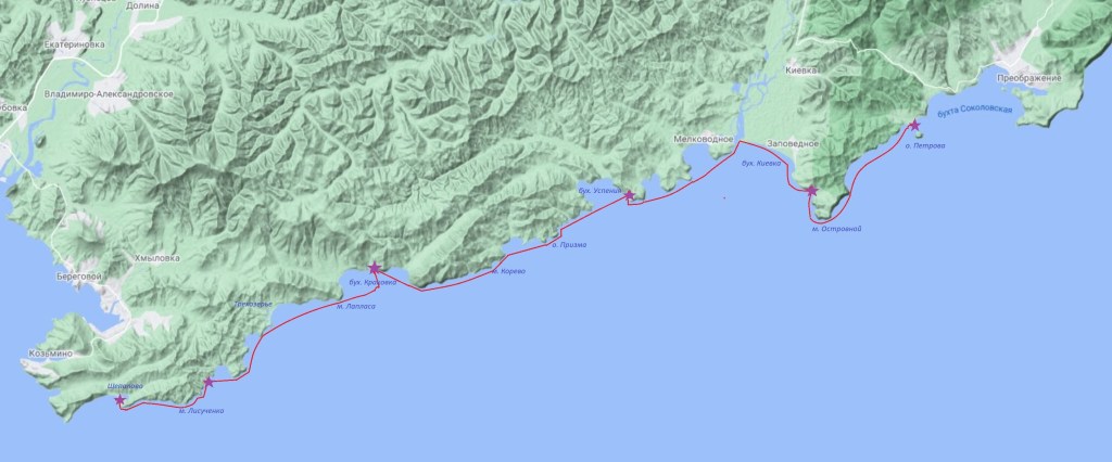 Конкретного плана практически нет. Есть направление – от Находки на северо-восток, и понимание, что спустя 2 недели, Наташа должна сойти (желательно) в Ольге, так как у нее заканчивается отпуск. Все остальное – по ситуации и погоде, как выбор места следующей ночевки, так и конечной точки всего поход. Эта точка конечно определена и это Терней, но поход запланирован как «отпускной», без напряга и амбиций, кроме одной «гребем в свое удовольствие». Даже если мы идем все 480 км до Тернея, на это заложены целых 3 недели, что для такого расстояния предостаточно (для сравнения, то же расстояние в 2018 году мы прошли за 12 дней).
