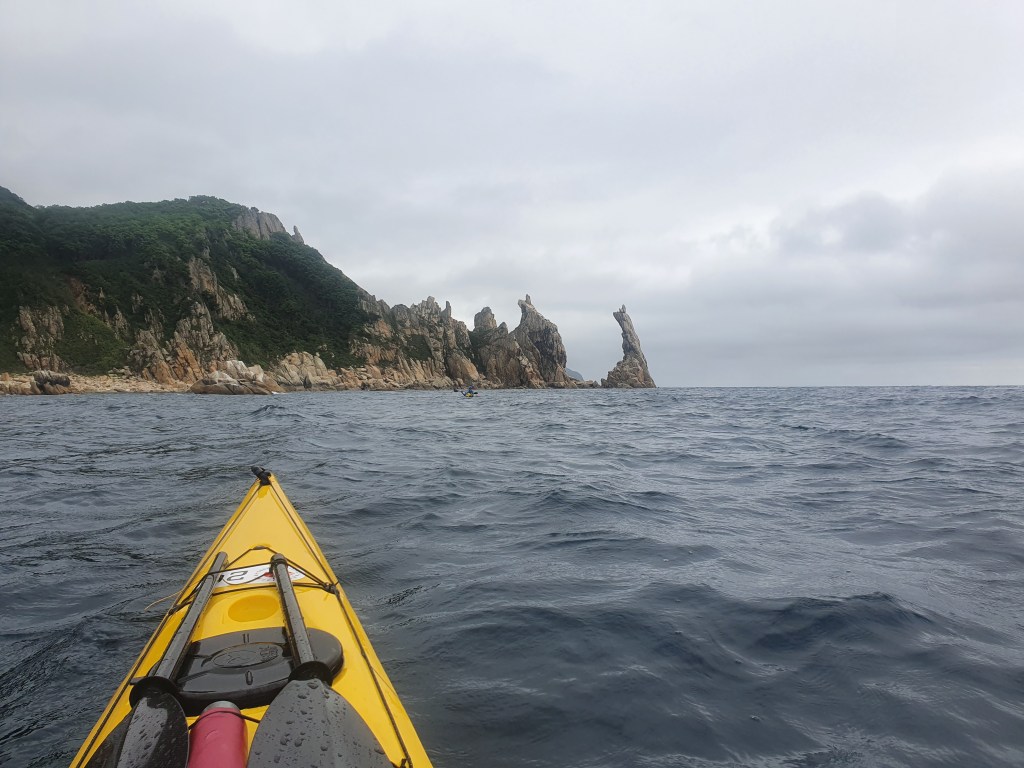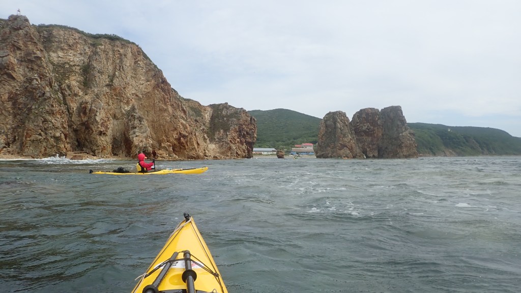 Выдвигаемся быстро, и идем вдоль мысов и бухт, проходя знаменитые скалы Крейсер. До них море очень спокойное, а вот сразу после попадаем в отраженную волну, около метра – первая из многих в этом походе «дискотек». Кстати, наш сахалинский термин «расколбас» или «колбаса», относительного этого же явления, ребята не понимают. Пока относительно нормально, и поэтому продолжаем к мысу Лапласа. Мысы южного приморья славятся своим драматизмом, и Лапласа именно такой мыс. Высоченные, острые пальцы вздымаются на высоту пятиэтажного дома, прямо над тобой. Ощущение под такими столбами, сродни того, что ты ощущаешь где-нибудь в деловом центре Нью-Йорка или Токио, только там ты окружен сотнями тысяч таких же людишек-муравьев, а под камнеными колоннами мысов япономорья ты совсем один. Впрочем, не в этот раз, сверху на нас удивленно тыкают пальцами пешие туристы. В южном Приморье людно.