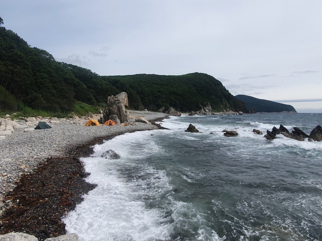 Поздно вечером ветер таки немного стих, но с приливом волна стала жестче, бросала камни, и даже иногда перехлестывала 1.5 м бруствер. Как и с сахалинской стороны, в Татарском проливе, тут часто работает правило – сначала дует ветер, потом приходит ветровая волна и продолжается примерно столько, сколько дул ветер. Если он дул 6 часов, значит и волна 6 часов, дул весь день, значит будет качать большую часть времени. В общем, было так громко и пугающе, что я посреди ночи подтащил лодку подальше от бруствера, а будильник вообще выключил – рассчитывать на выход с утра не стоит.