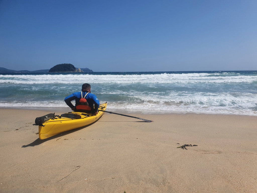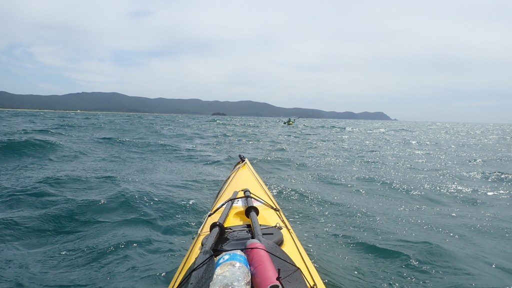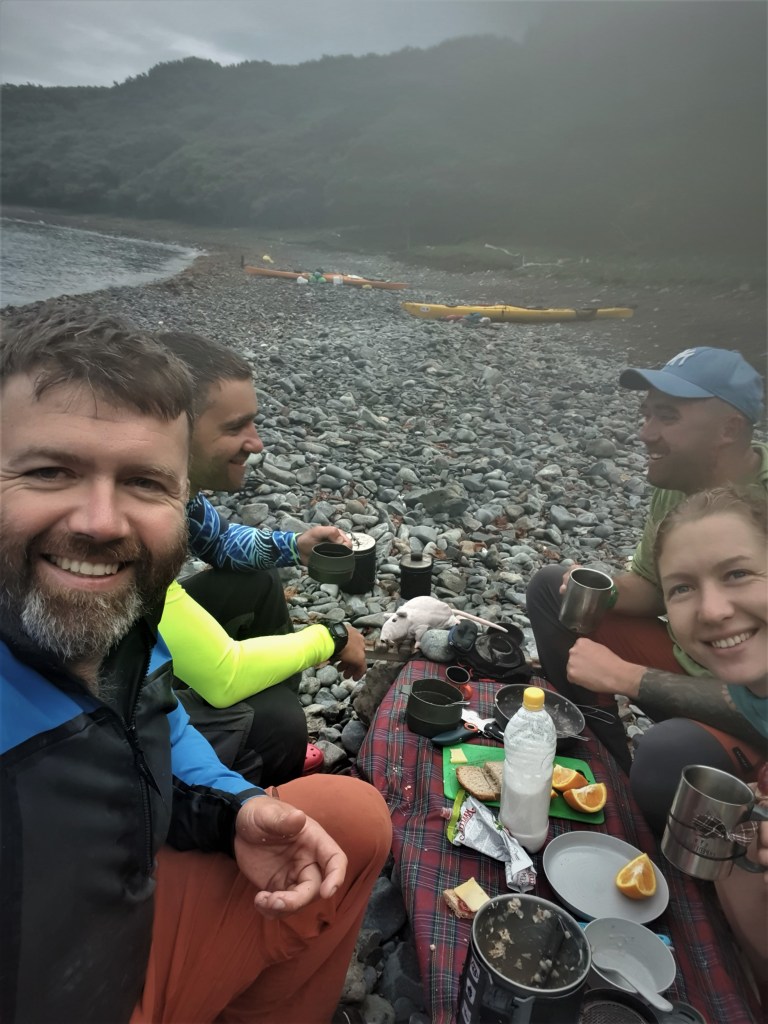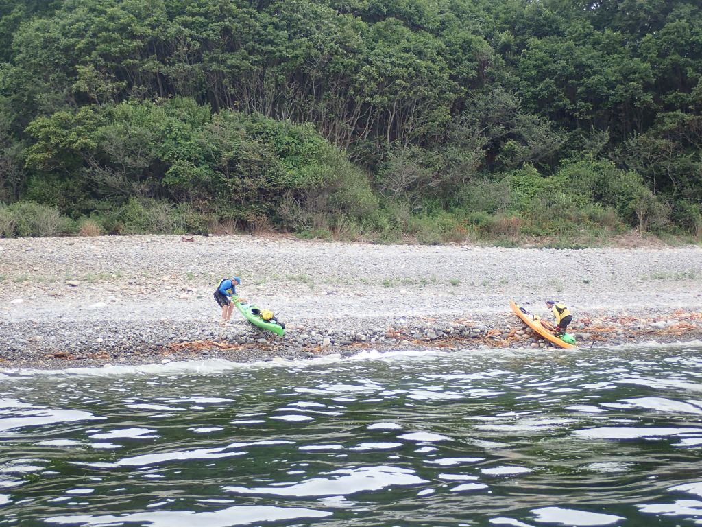 Мы в центре бухты, примерно в 2 км от берега, практически на открытом участке, тут и там ломаются волны и толкать весла против ветра становится сложно. Прямо на берегу просматривается небольшой пляж, видно, что не песчаный и довольно крутой, но без признаков жилья. Догоняю Никиту с Артемом, и без лишних обсуждений мы решаем выпрыгивать туда, обедать, и смотреть, что будет дальше.