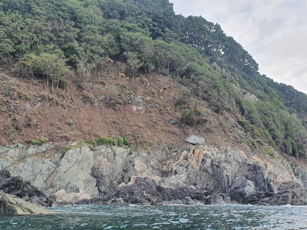 Все сборы оперативно, каша в норме, море тихое, выходим, как и предполагалось чуть после 7. Точка назначения – бухта Киевка, восточная ее оконечность, максимально приблизиться к мысу Островному. Артем немного впереди в этот раз, я с ребятами, идем не спеша, фотографируя тут и там оленей на отвесных утесах, а следующие бухты режем поперек. Это бухты Каплунова и Мелководная, и туда нам хода нет, так как много лет они «принадлежат» сильным мира сего, и если туда зайти, то оттуда очень быстро попросят, возможно под прицелом карабина. На входе в бухту Мелководную вообще раньше стоял знак – «Заход запрещен», но перед выборами пару лет назад его таки убрали.
