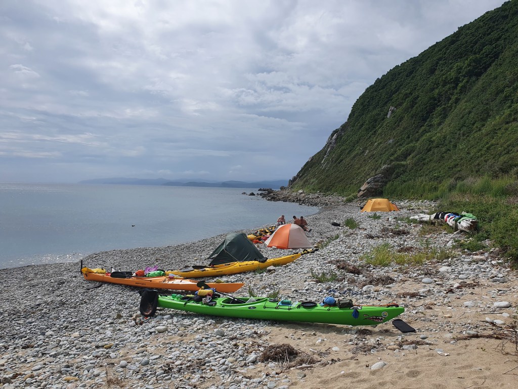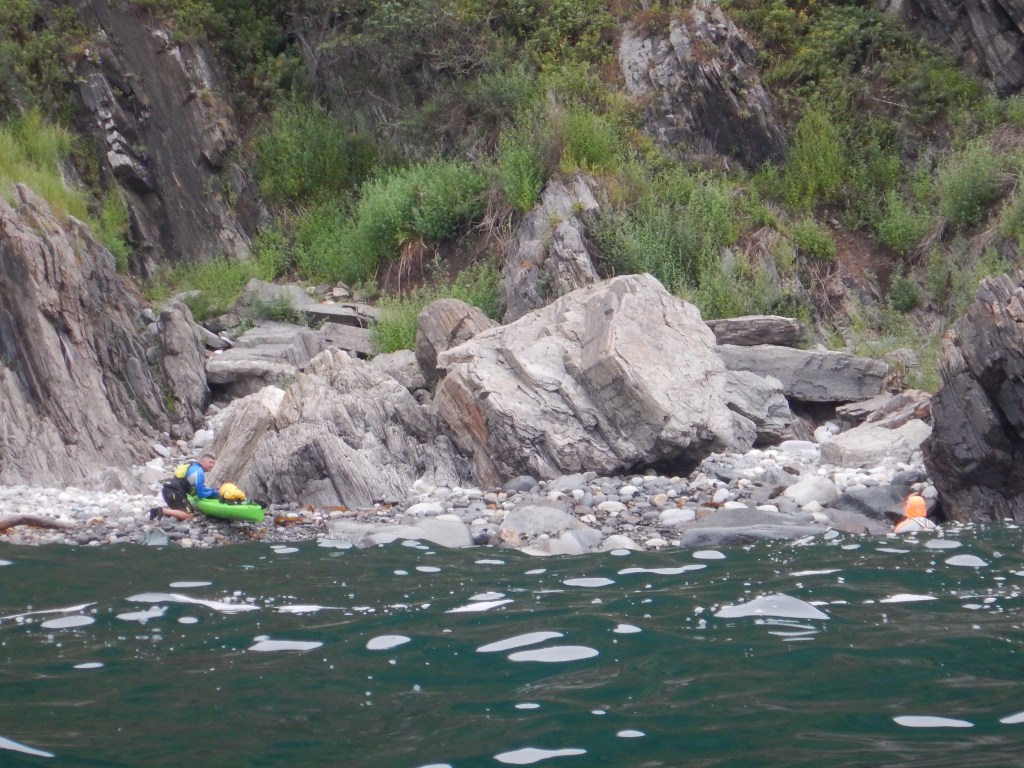 Тишь и гладь, а также солнышко прямо под берегом воспринимаются прямо сюрреально. Правда на входе в нашу планируемую бухточку ветерок задувает, но это не идет не в какое сравнение с тем что было в основной бухте. В планируемом месте стоянки уже кто-то стоит, пара машин, а с другой стороны – что-то похожее на каяк с палаткой. Подходим туда. Место есть, хоть и на крупной гальке и высокой полке. Все, баста, набегались, высадка.