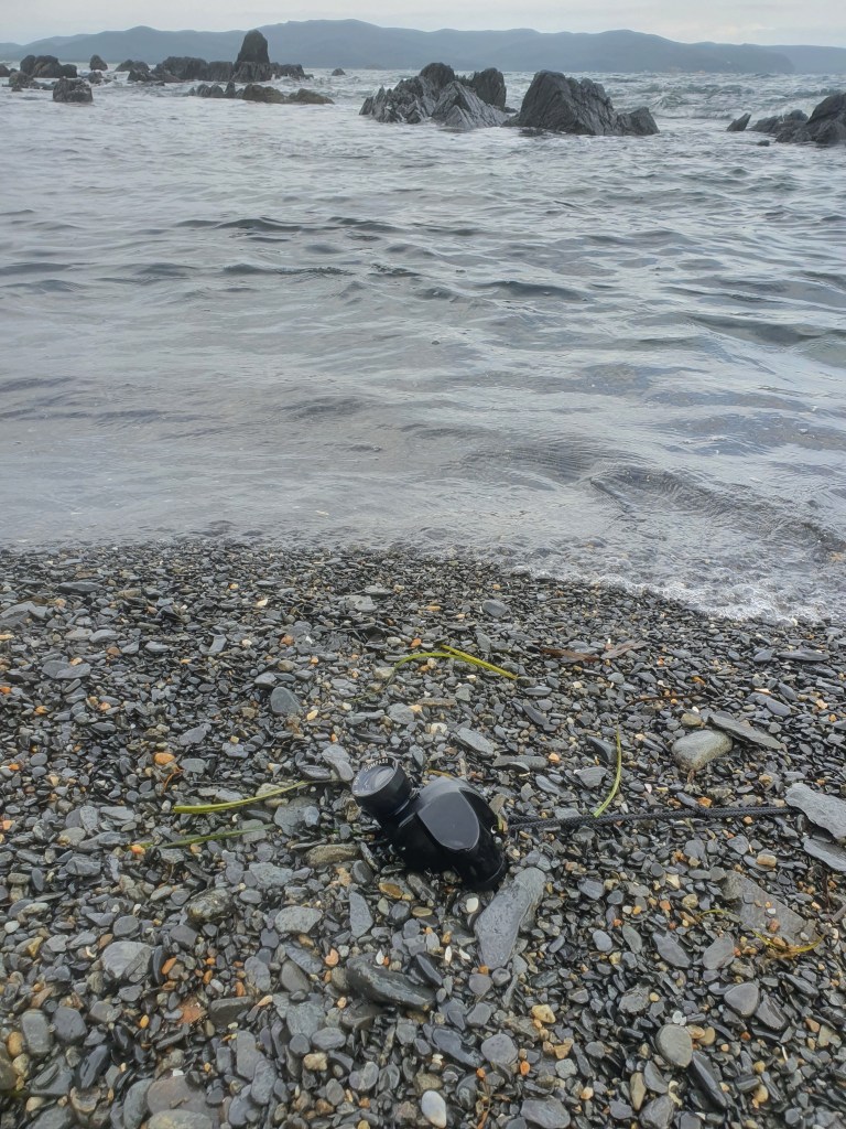 В общем гребу. По идее можно было бы рвануть прямо напрямую, и сократить путь где-то на целый километр, но в одного, в таком ветре и с волной совершенно не хочется, и поэтому забираюсь глубоко в бухту, с намерением грести почти вплотную к берегу. Ветер просто адовый, точно сильнее, чем когда мы пришли. До островка в глубине меня просто тащит, а возле него, совсем у берега метровые крутые волны. В его тени конечно проще, иду в ней некоторое время, и уже дальше от восточной стороны бухты ветер и волны в целом не такие сильные. В конечном итоге я корректирую курс, и иду точно на пляж, где должны быть мои вещи. Как результат 7 с хвостиком км пройдено за 49 минут и это быстро. Высаживаюсь, иду к камням и нахожу… пачку туалетной бумаги. А вот монокля нигде нет. Черт, обошел весь пляж два раза, по своим же следам, все осмотрел. Нет! Растроеный вызываю ребят по рации, сообщаю положение дел и что скоро пойду назад. Артем сочувствует. Решил посидеть немного, заточить сникерс, параллельно снова перебирая лодку. Но нет, монокля нету. В какой-то момент мне на глаза попадается «куриный бог», злой, я кричу «да ну тебя нафиг!», и выкидываю его в море. Развернул лодку, поставил на выход, залезаю в очко и взгляд падает на мокрый песок прямо перед лодкой… и тут, прямо в полосе прибоя… лежит мой монокль. Либо он пролежал здесь, либо его только что выкинуло волной (что тоже вероятно, так как тут лагуна с круговоротом), непонятно… но очень легко сделать вывод, что за рог море вернуло один предмет, а за куриного бога уже второй. Хотите верьте, хотите нет..