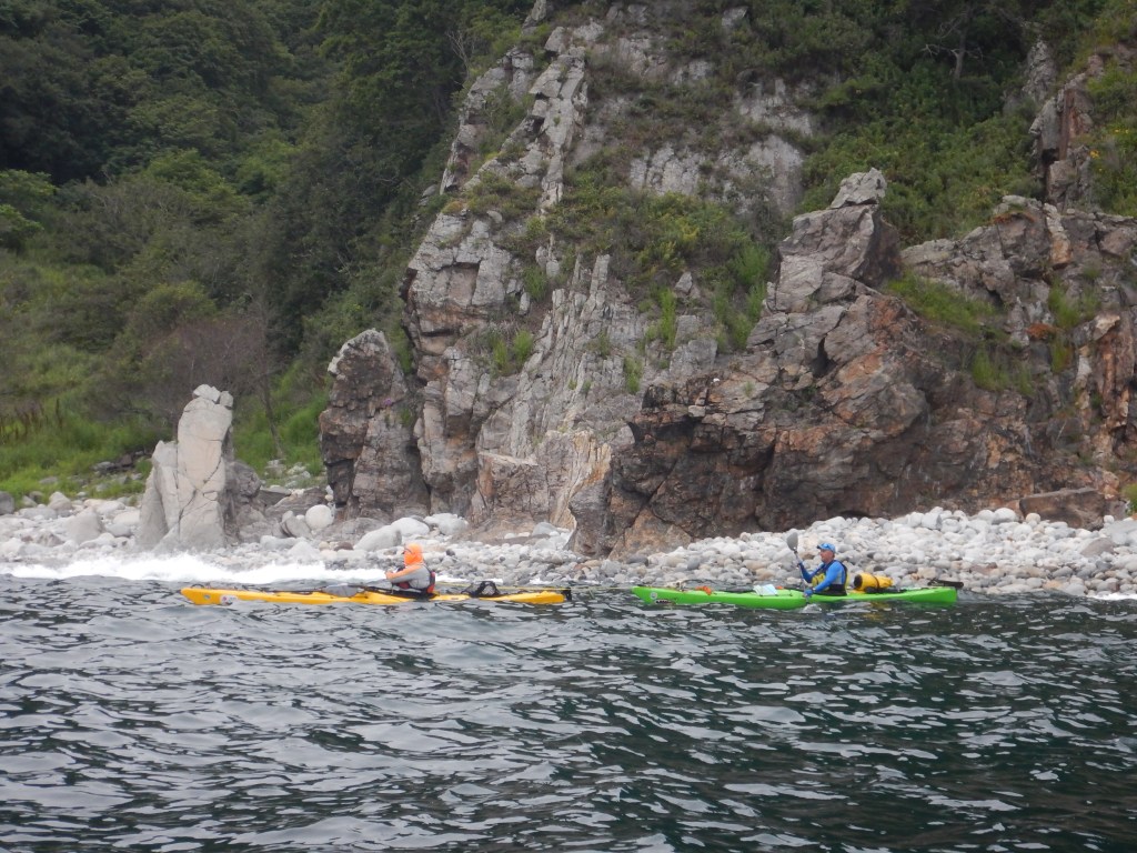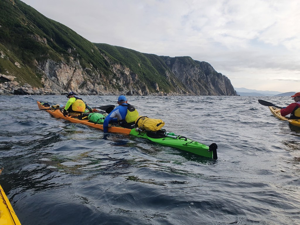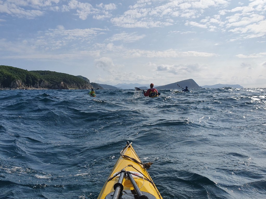 Однако идиллия продолжается недолго, до м. Сысоева, с восточной стороны бухты. Здесь скальная стенка, и волны создают толчею. Группа держится уверенно, ничего критичного, продолжаем движения. Но уже через км Никита вскидывает руки вверх и ругается. У него лопнул тяговый тросик руля с правой стороны, и идти становится очень непросто. Возвращаться не вариант, но и до следующих бухт порядочно. Сначала выпрыгиваем в микробухте с закрытой западной стороны следующего мыса, где выясняем, что ремонт на ходу невозможен. Единственным вариантом, кроме «терпеть», помочь Никите с направлением – взять на буксир, который у меня поясе, что мы и делаем немедленно.