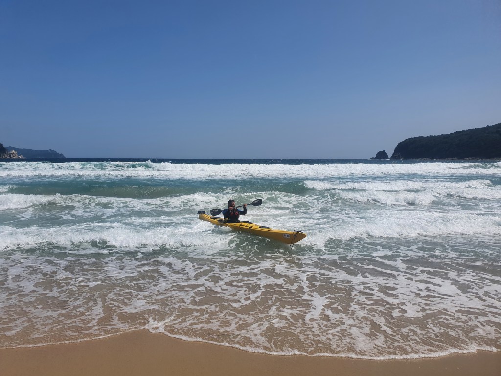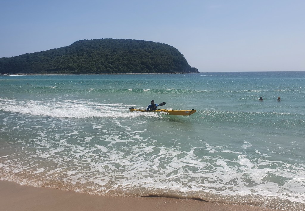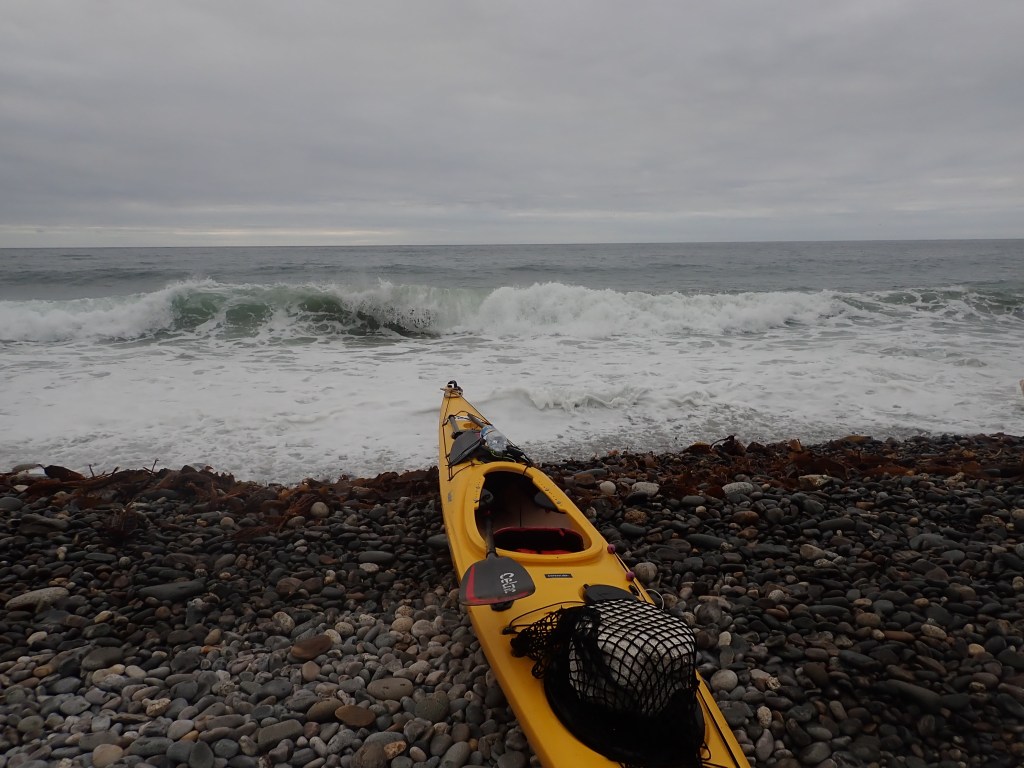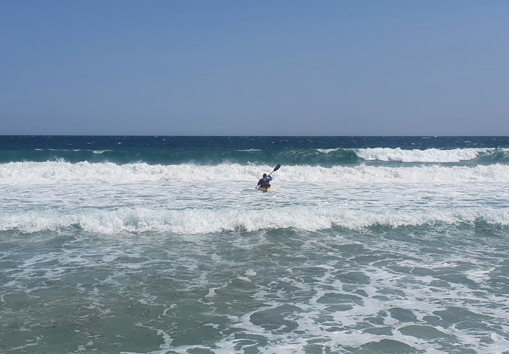 Я же выхожу на произвольную сессию серфинга – не пропадать же такой волне. Ну и заодно немного тренирую эскимоса. Волна довольно высокая, но с инерционной точки зрения совсем не мощная, локальные ветровые волны всегда такие. Лодка с легкостью проходит через самую высокую, четвертую линию прибоя, спокойно выходит на серфинг. Правда повернуть этот контейнеровоз крайне сложно, особенно учитывая ветер, но остойчивость у него отменная. Ложусь дважды, встаю. Место для тренировки конечно отличное, можно выбрать любой уровень, а можно вообще спрятаться от волны.