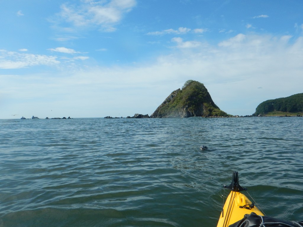 Ветер уже задувает, море совсем не ртутное как накануне, но под мысом тихо. Сам мыс проходим относительно спокойно, но уже в 500 метрах, вдоль восточной стенки начинается болтанка. Ветер усиливается, и идем мы медленно. Надо поскорее пройти эту стенку и резать на бухту Петрова, которую, вместе с одноименным островом отлично видно в 10 км восточнее. Двигаемся не очень быстро, и тут, бах… Артем останавливается. Подходим и видим, что у него нет руля, он болтается на направляющих. Срезало палец на котором он крепится, ремонт возможен только на берегу. Артем идет дальше без него. В знак солидарности и ради эксперимента убираю свой руль, с одной стороны чтобы не убегать далеко от группы, с другой, интересно как поведет себя Экспедишен в таких условиях.