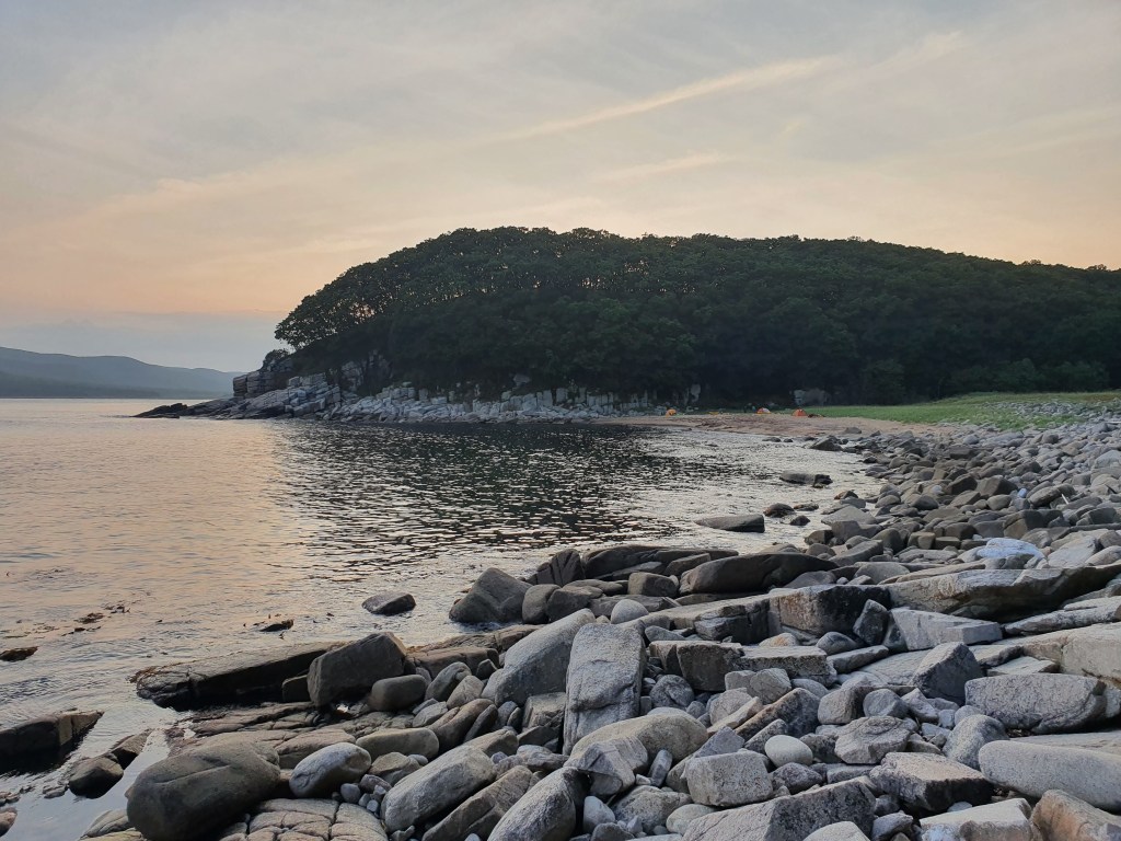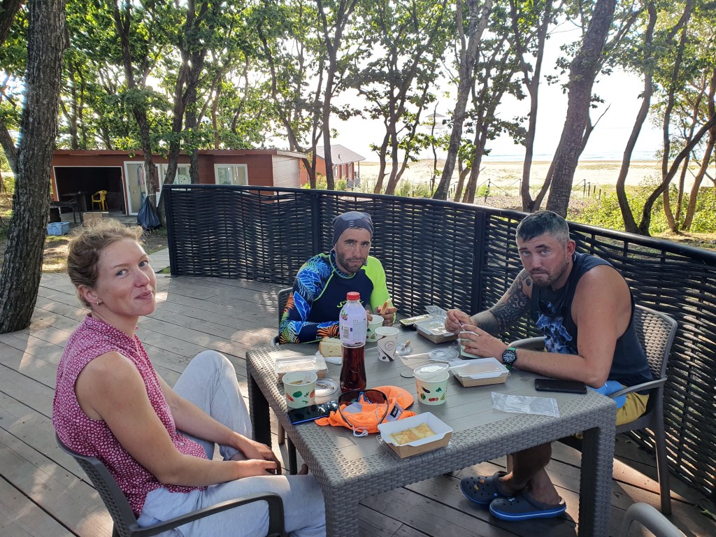 Пляж здесь – очень крупная галька, множество «страусиных яиц». Но место притулиться мы все же находим. Зато здесь много воды и связь 4G. Опять все залипли в телефонах, на 10ый день очень актуальна тема в чатике, о том, как можно проходить 36-42 за 6 часов. Мы как раз прошли 39 км. Примерно за 11 часов. Надо что-то с этим делать, если можно за 6!!! Но что??? Будем думать завтра? Нам нужен как минимум еще один сорокет, чтобы догнать график.
