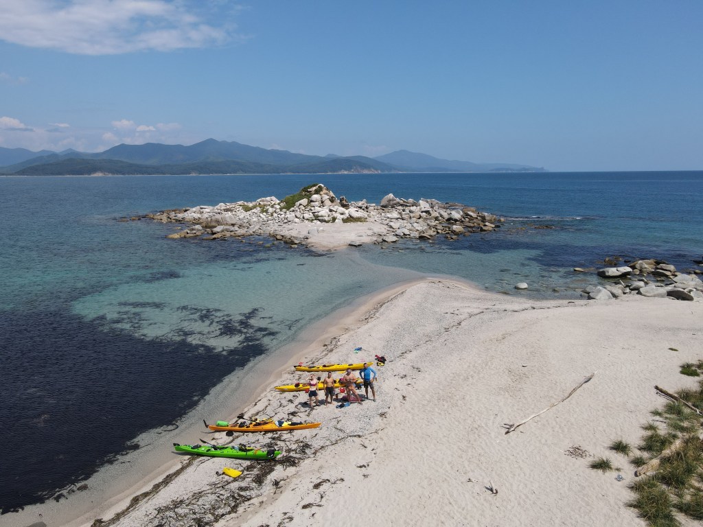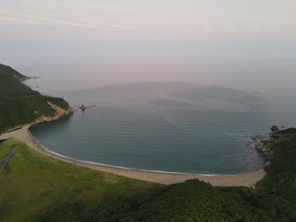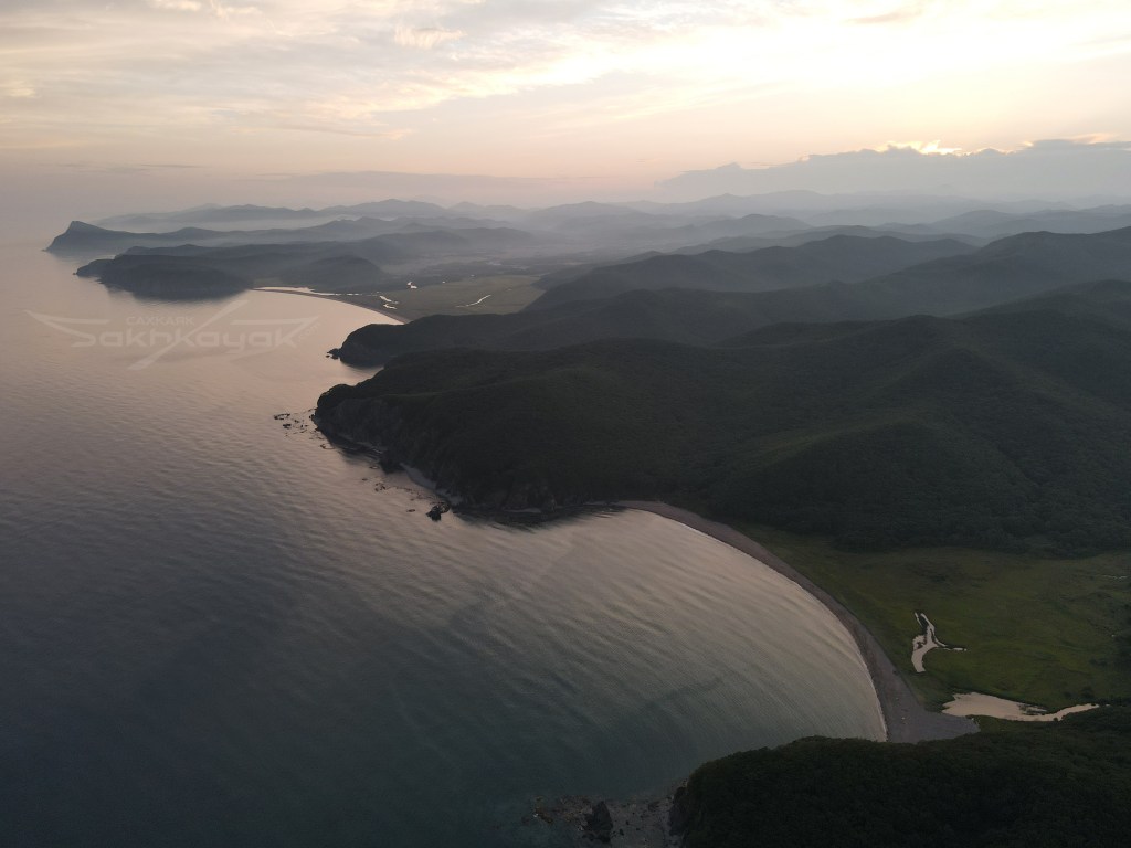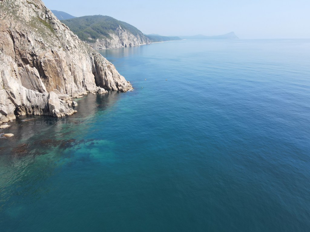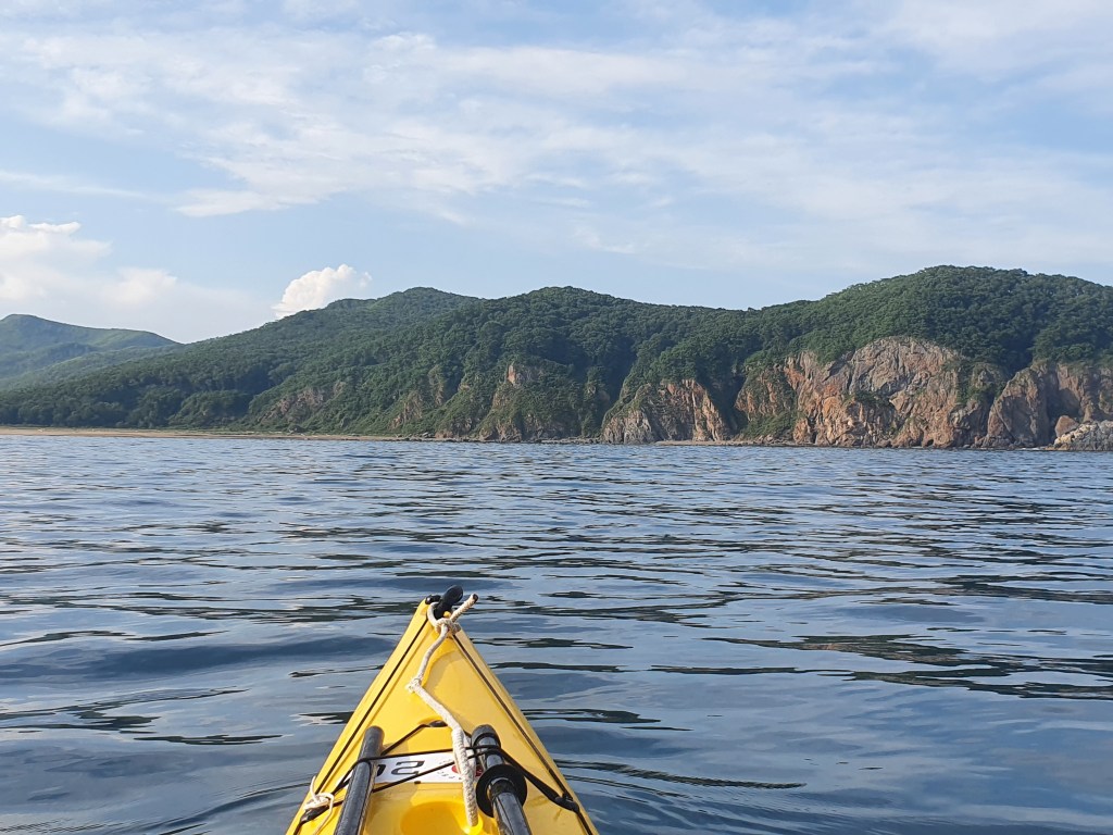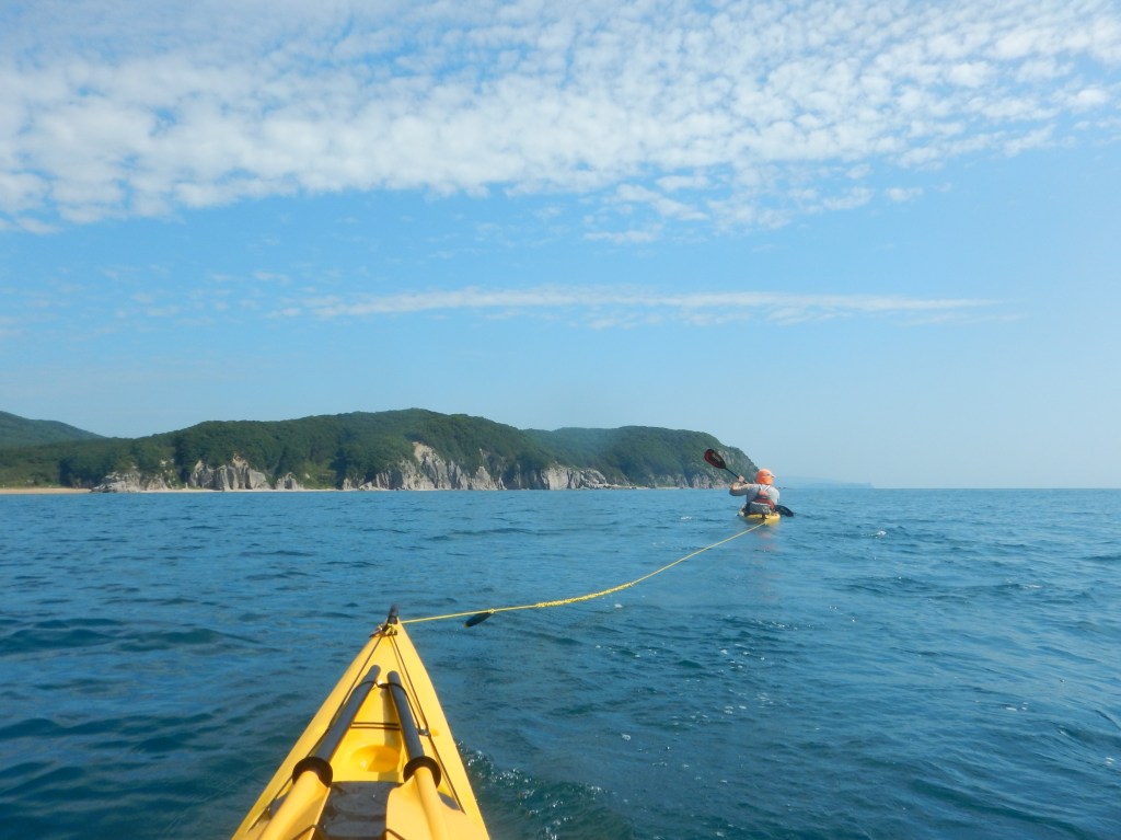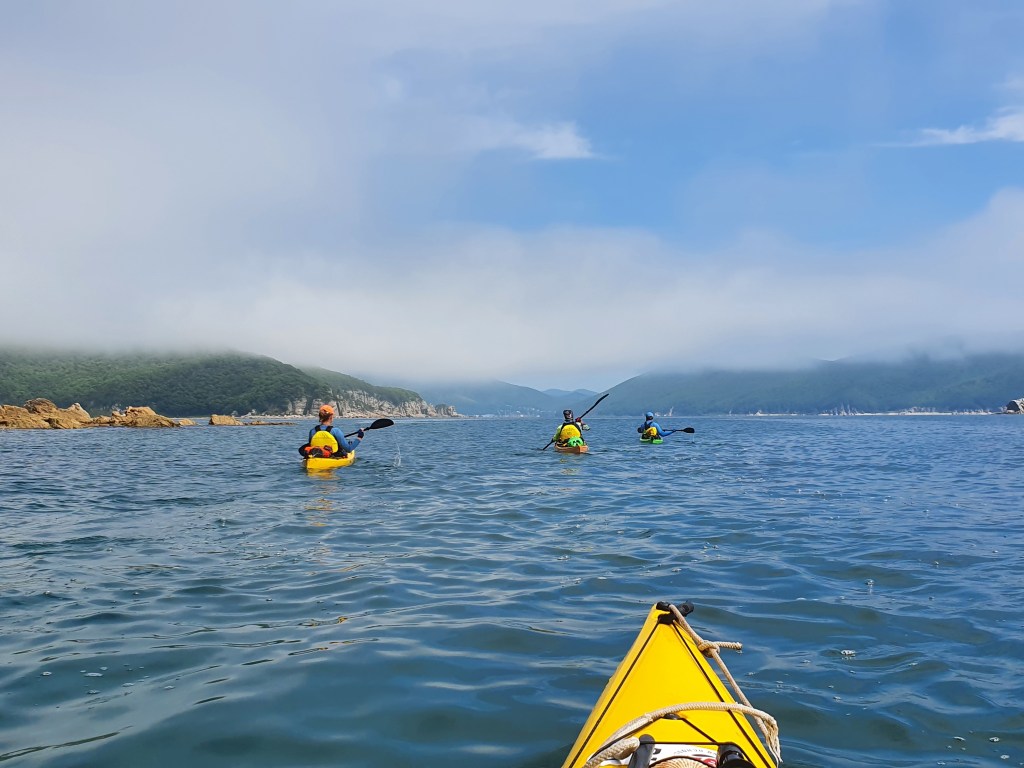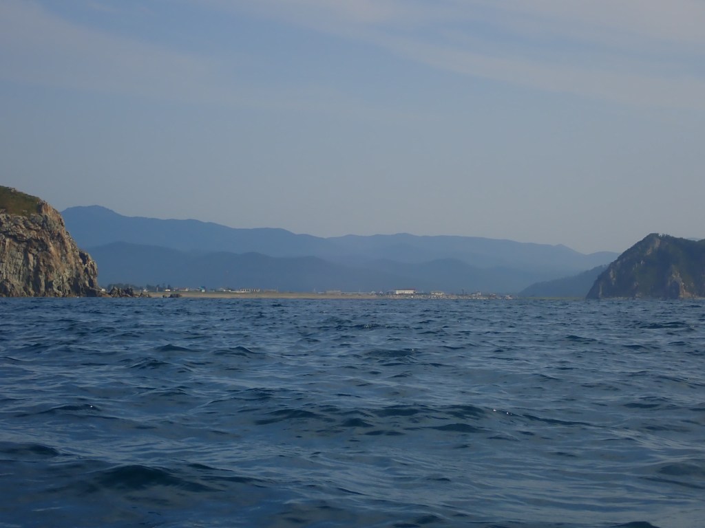 За мысом Красная скала – полнейший штиль, море серо-голубой шелк, как-то неописуемо тихо. Проходим траверз Милоградовки, и знаковое место – м. Горбатый. Именно здесь произошла встреча двух гребных цивилизаций – приморской и сахалинской в 2018 году.