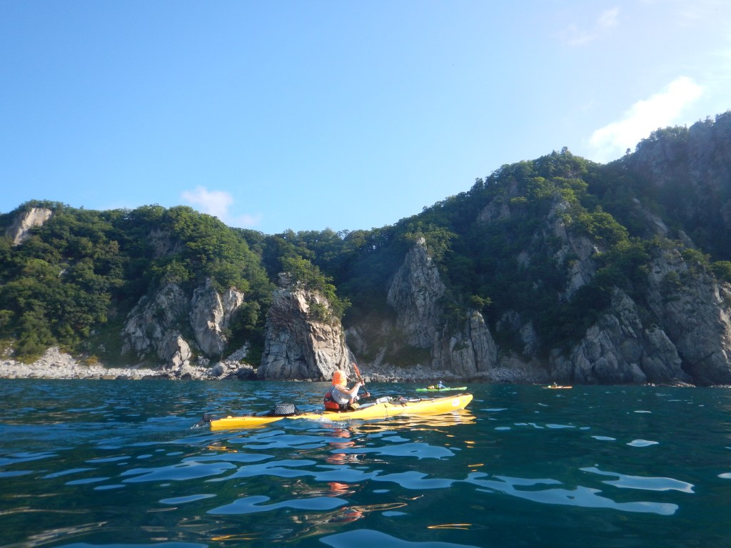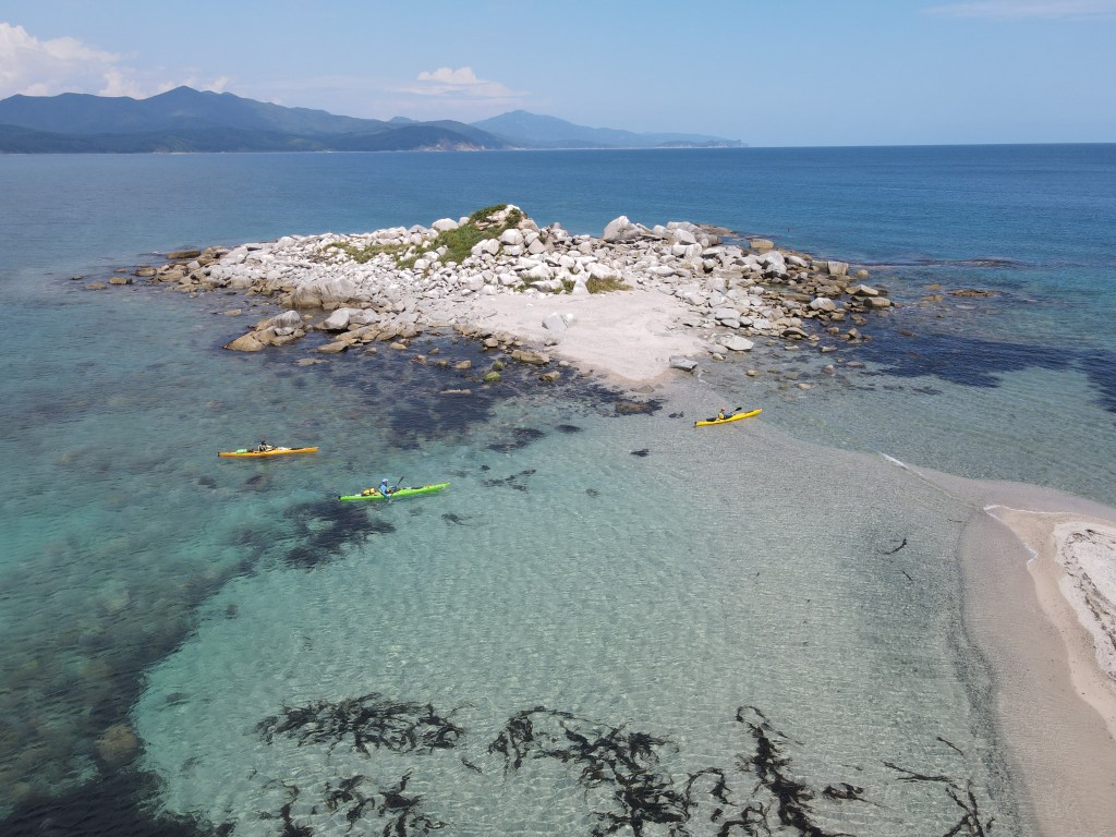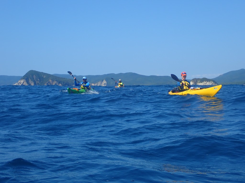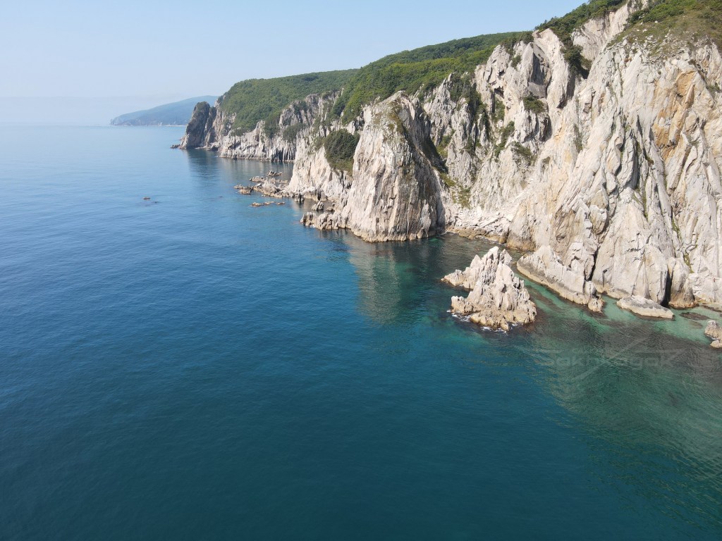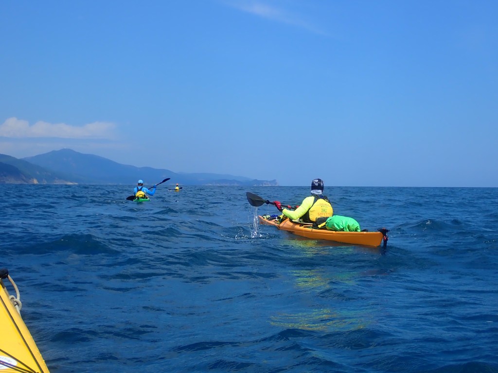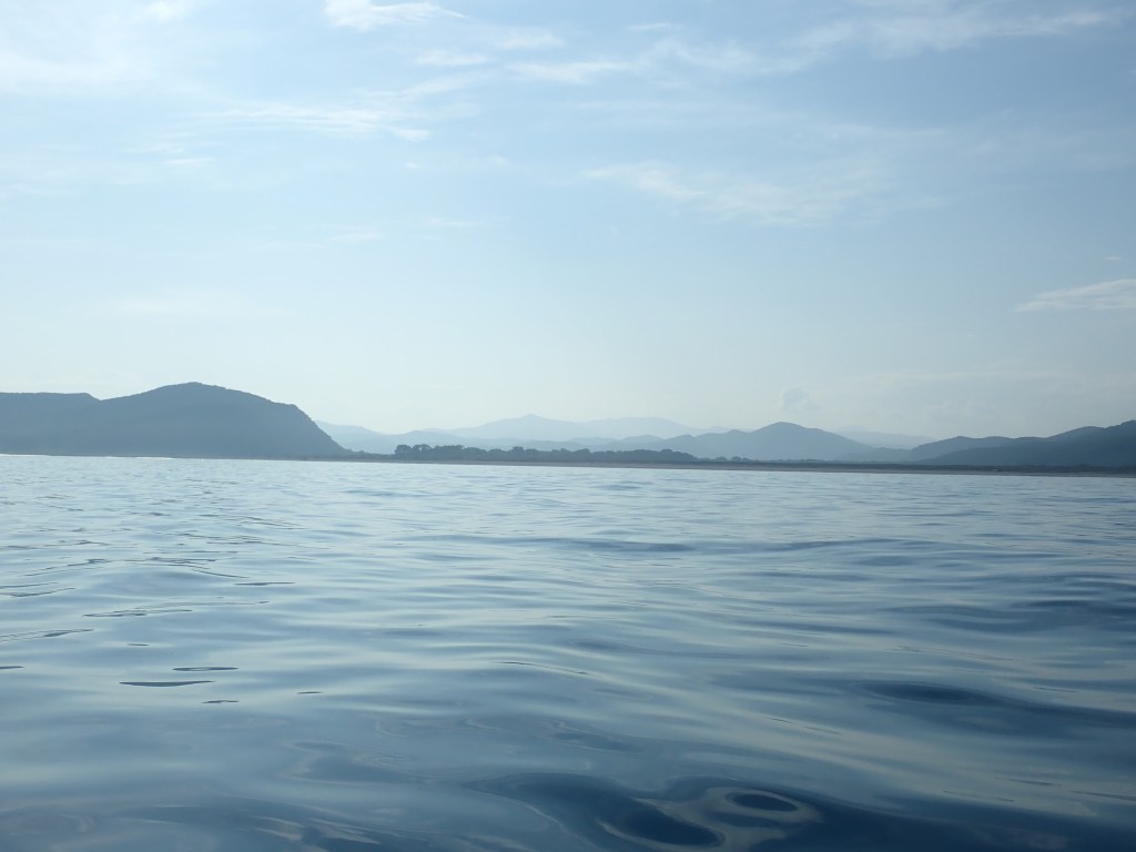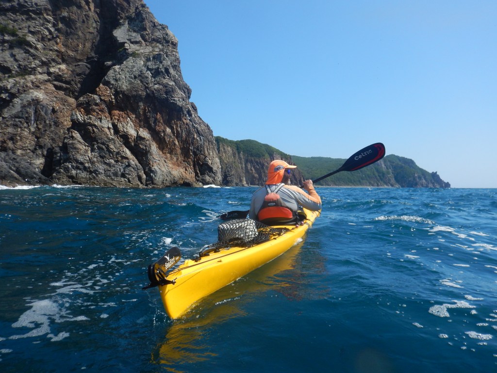 За мысом Красная скала – полнейший штиль, море серо-голубой шелк, как-то неописуемо тихо. Проходим траверз Милоградовки, и знаковое место – м. Горбатый. Именно здесь произошла встреча двух гребных цивилизаций – приморской и сахалинской в 2018 году.