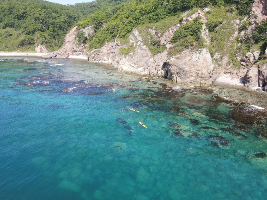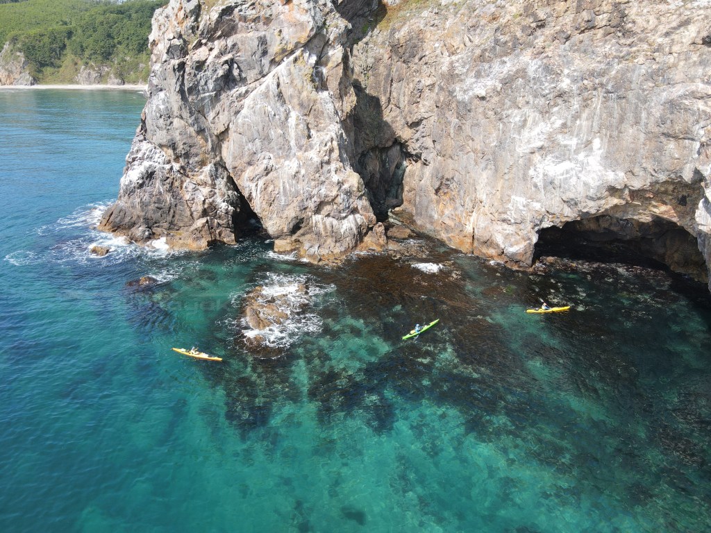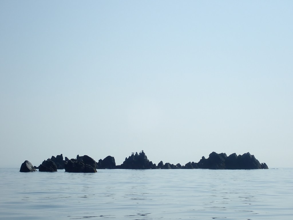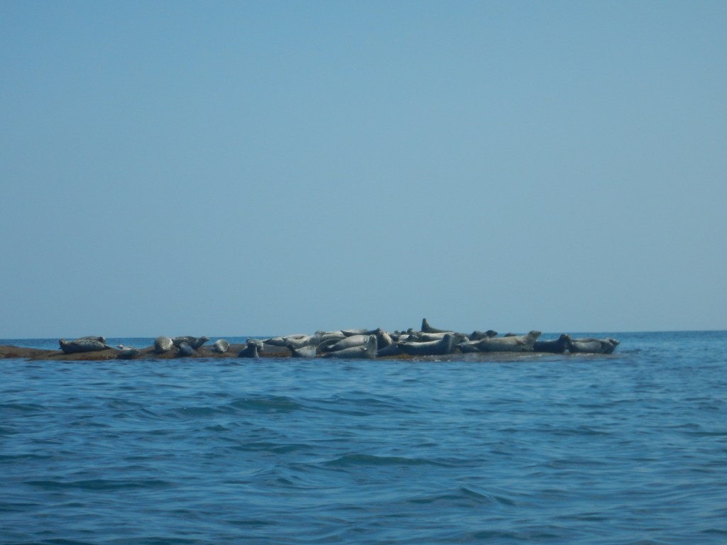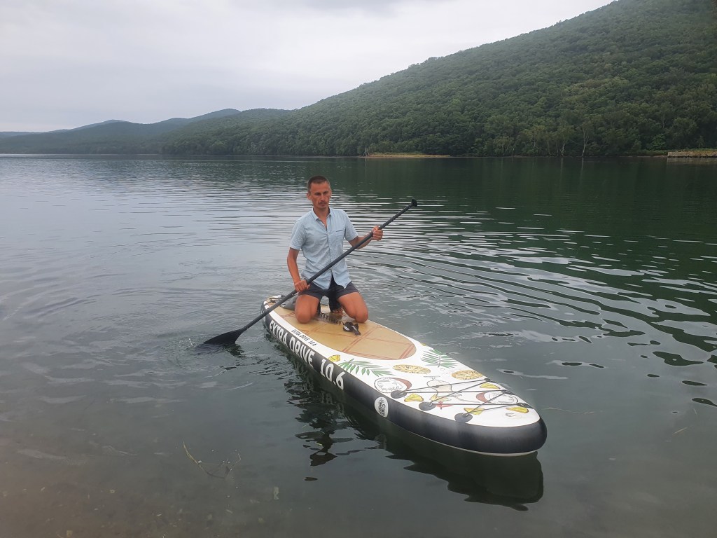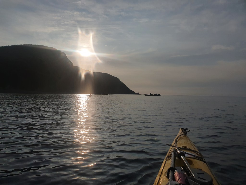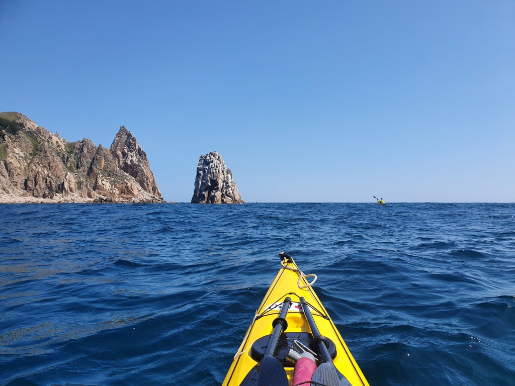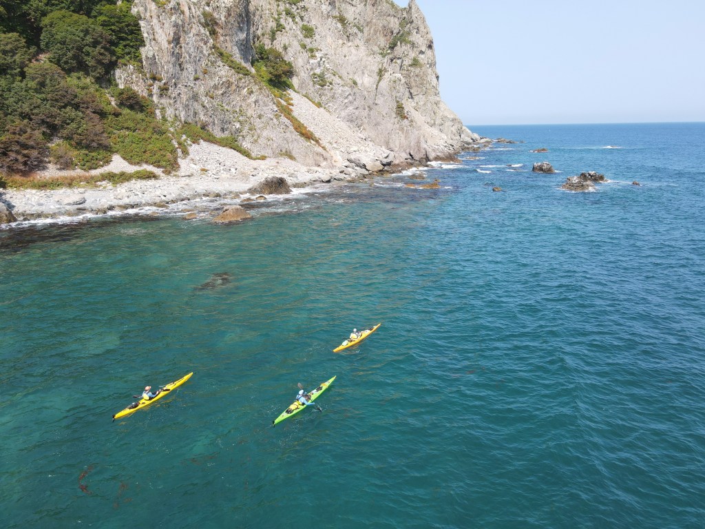 За мысом Красная скала – полнейший штиль, море серо-голубой шелк, как-то неописуемо тихо. Проходим траверз Милоградовки, и знаковое место – м. Горбатый. Именно здесь произошла встреча двух гребных цивилизаций – приморской и сахалинской в 2018 году.