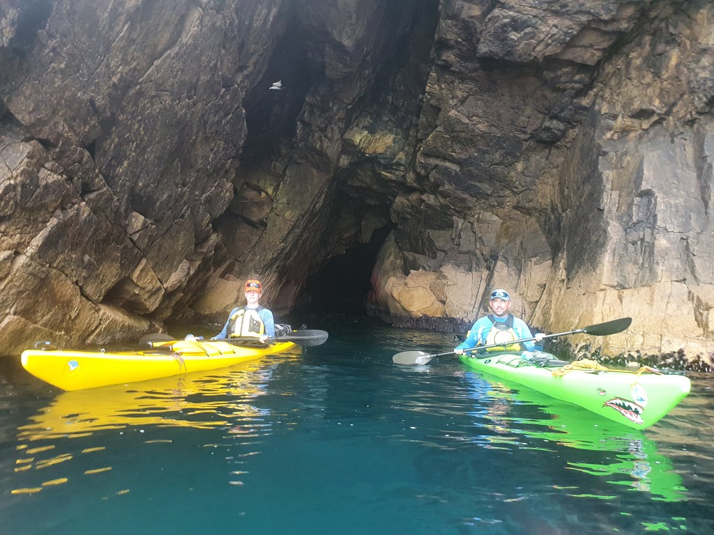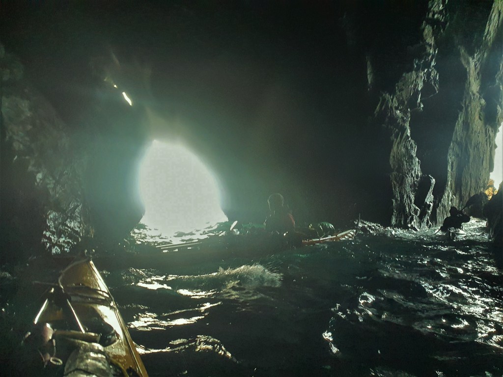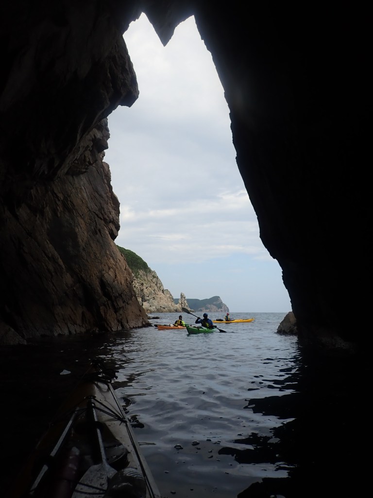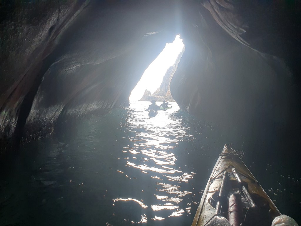 На мысах не только пещеры, тут люди ныряют со скал, протянут зип-лайн. Хотя на скалах стояли парни в неопрене, явно готовясь прыгать, при нас они это так и не сделали. Пересекаем бухту, и после фотосессии у больших непроходных ворот, заходим в самую длинную пещеру этого похода – длинный 60-метровый грот, ухающий даже в эту, относительно спокойную погоду. Наташа и Артем здесь впервые, реакция полного восторга. На самом деле, грандиозно. Очень повезло, что погода наконец стихла.