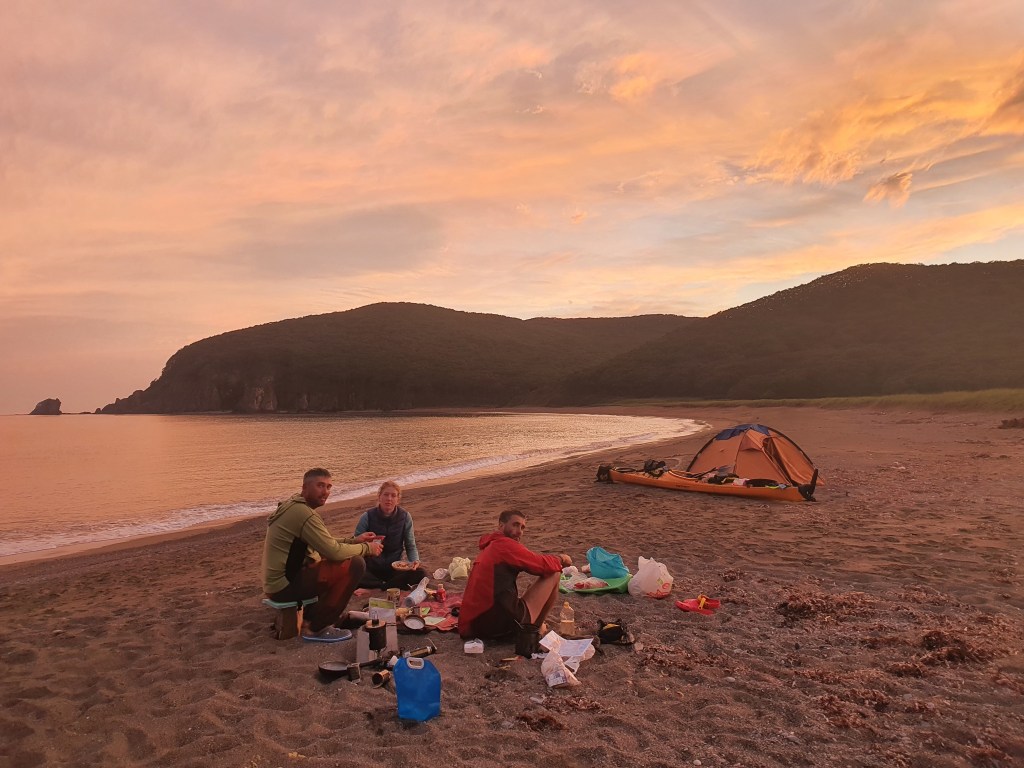 Похоже либо кто-то просто помер, либо утонул в этих местах. Ну и конечно как водится – очередной скелет на берегу, череп цапли. Что не ночевка, то очередной вечер канала ужастиков. Впрочем, нам все равно. Ужин, досиживаем день и в люльку. Не смотря на 3 продуктивных дня, завтра мы можем окончательно нагнать график, если дойдем до бухты Евстафия. Впрочем, с обеда обещают ветер, поэтому не факт что сможем туда дойти. На одометре 183.2 км.
