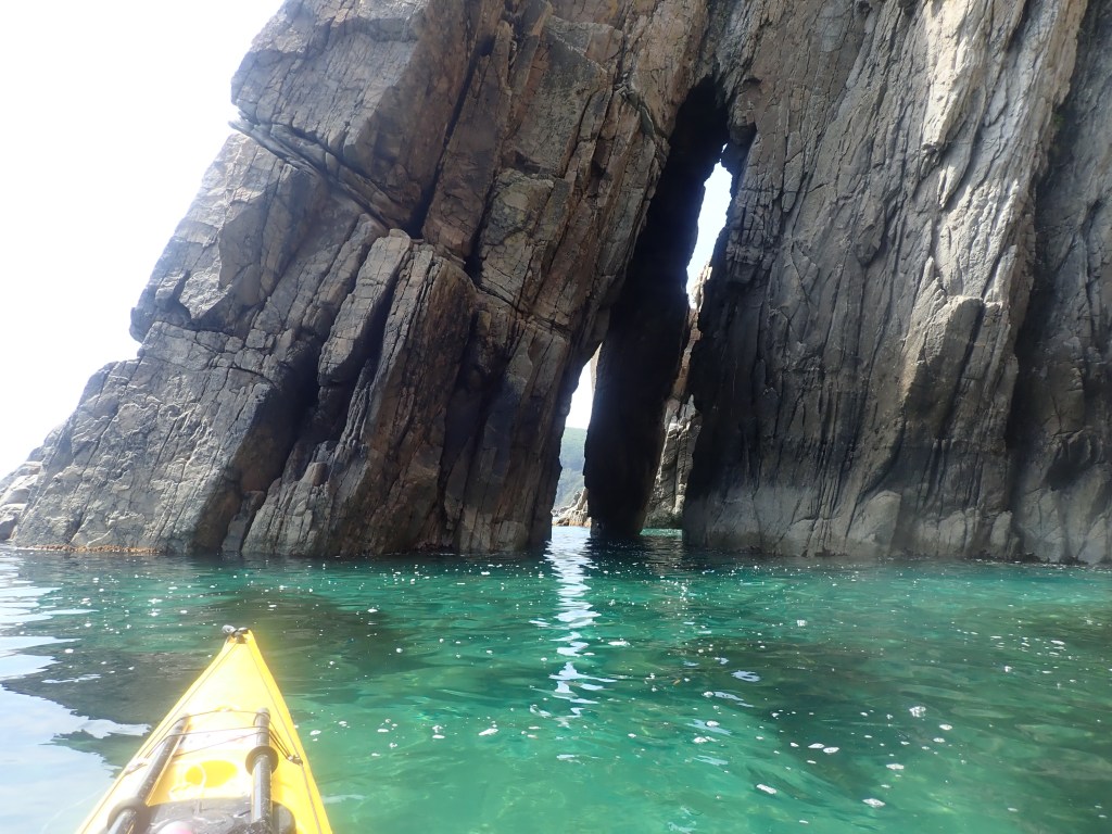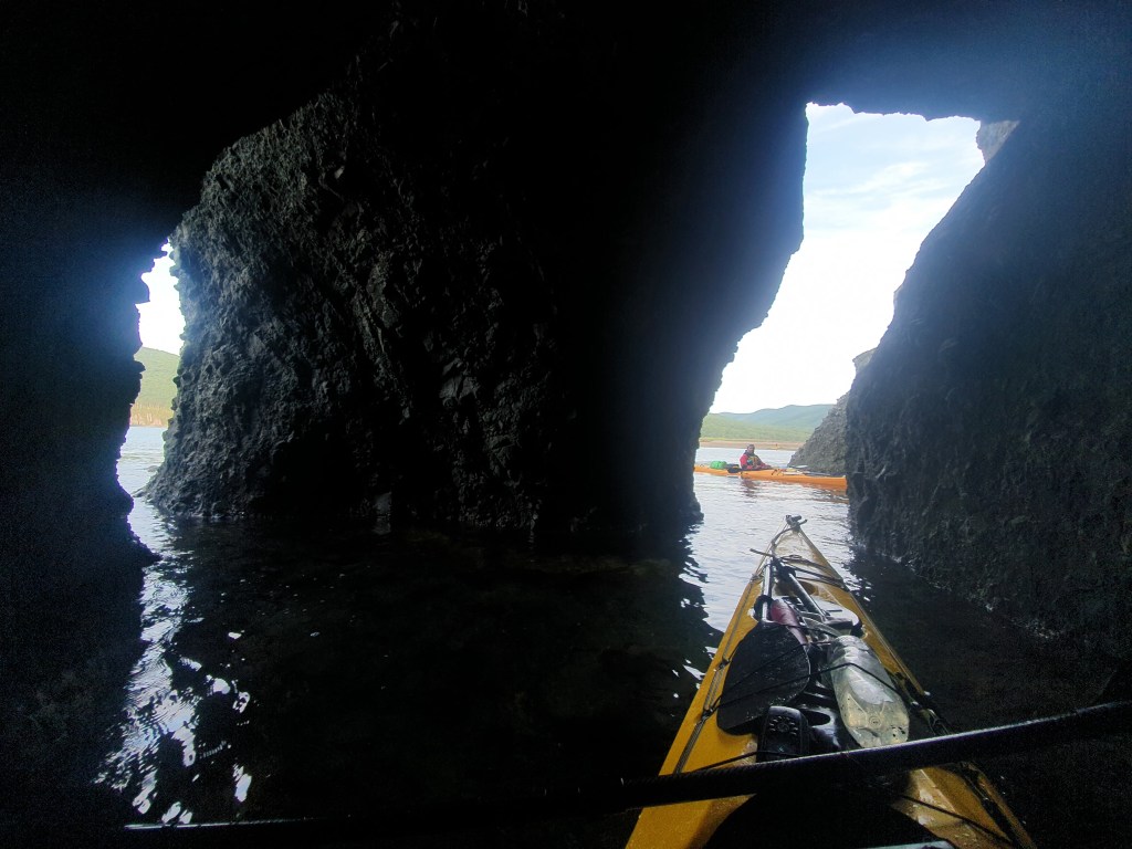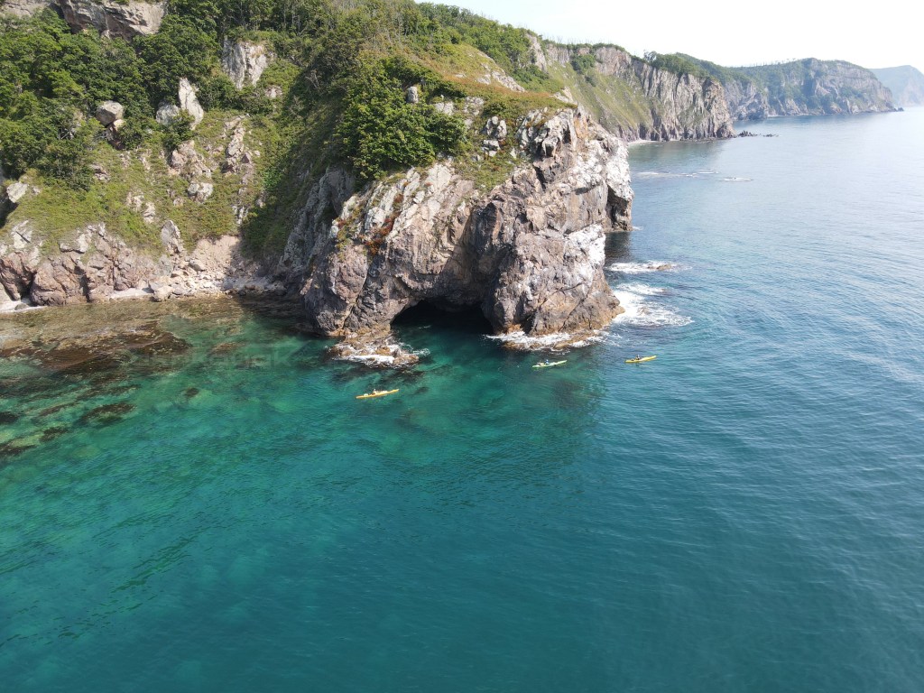 Сразу за мысом потрясающая пещера, снимаю ребят, а потом и сам прохожу через нее. Ландышевая прямо за ними – хорошая бухта, начинаю ее резать, но не сильно, прямо за ней у берега красивейшее место с 2 последовательными арками. Как потом выяснилось, ребята туда не зашли, а я помнил о ней еще с нашего прошлого похода.