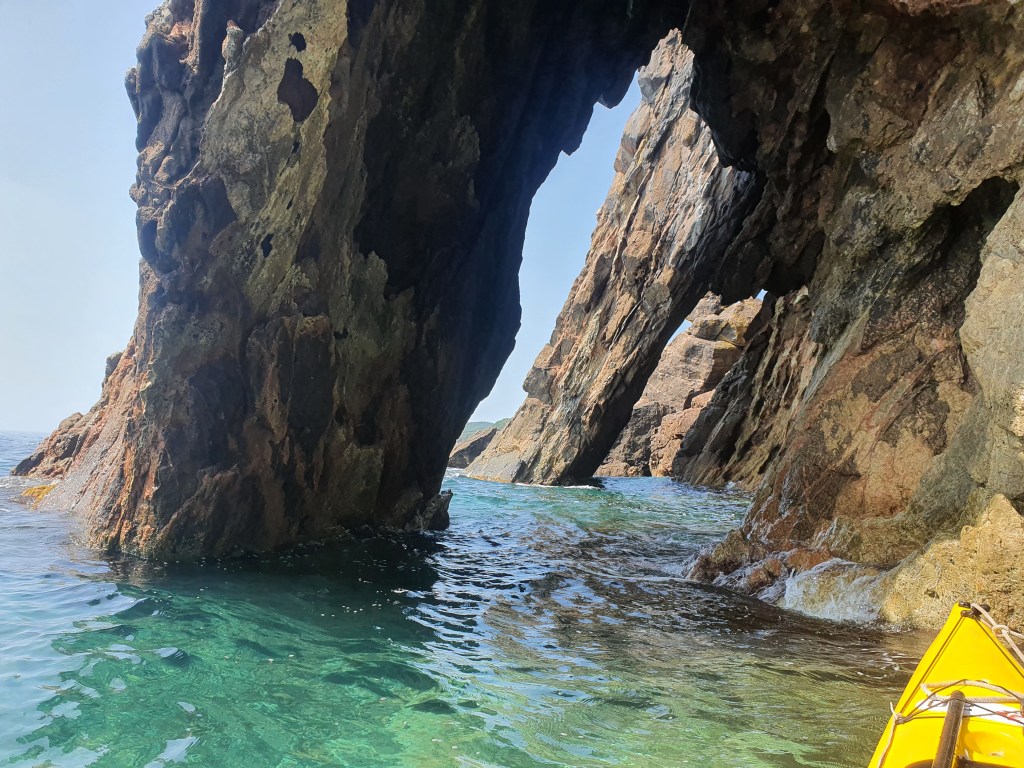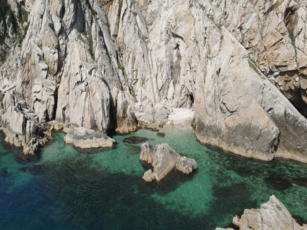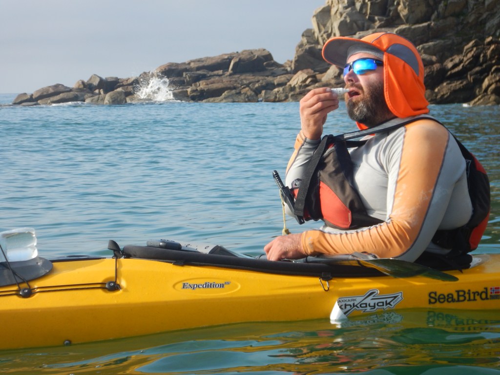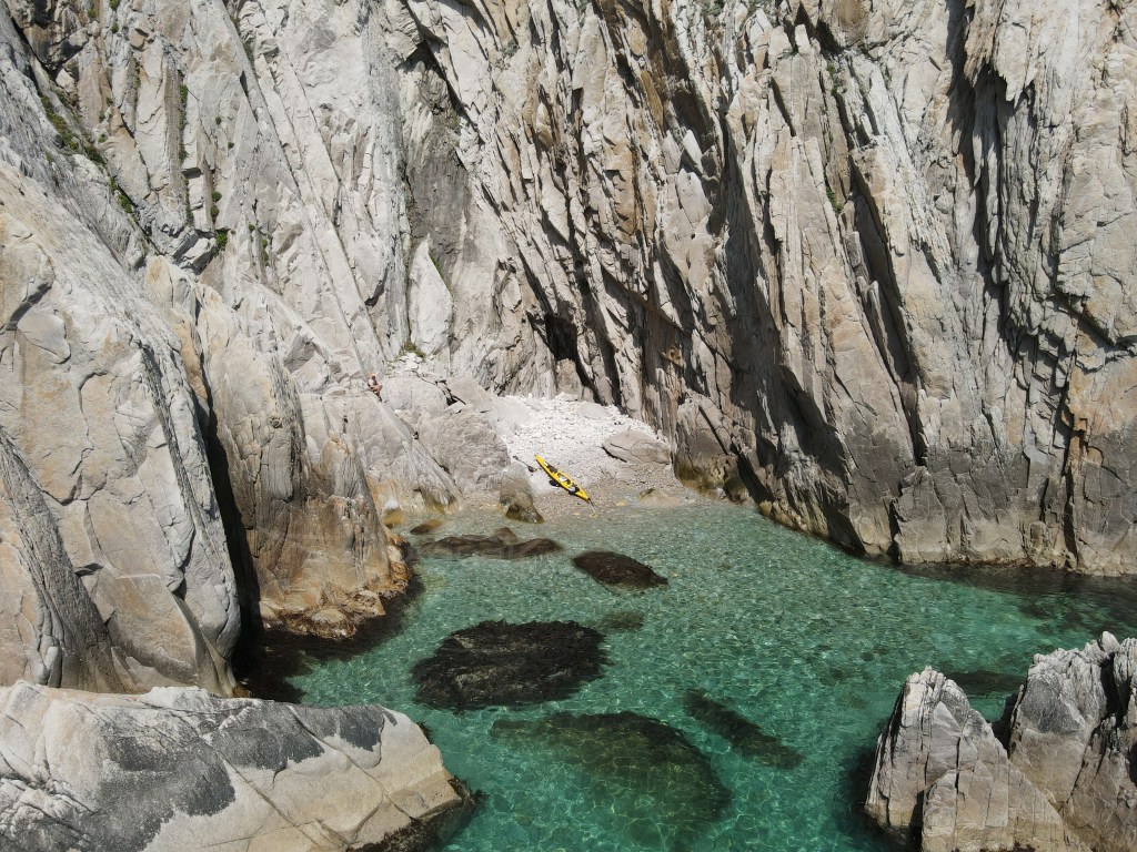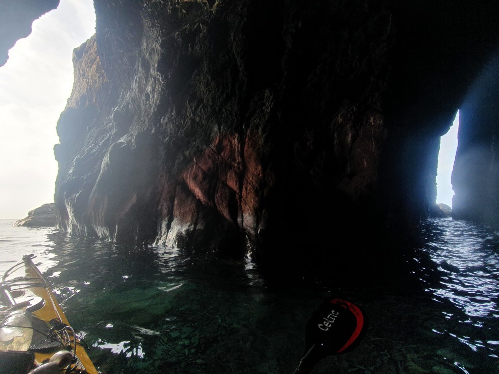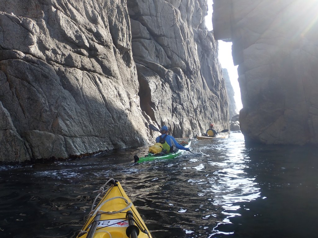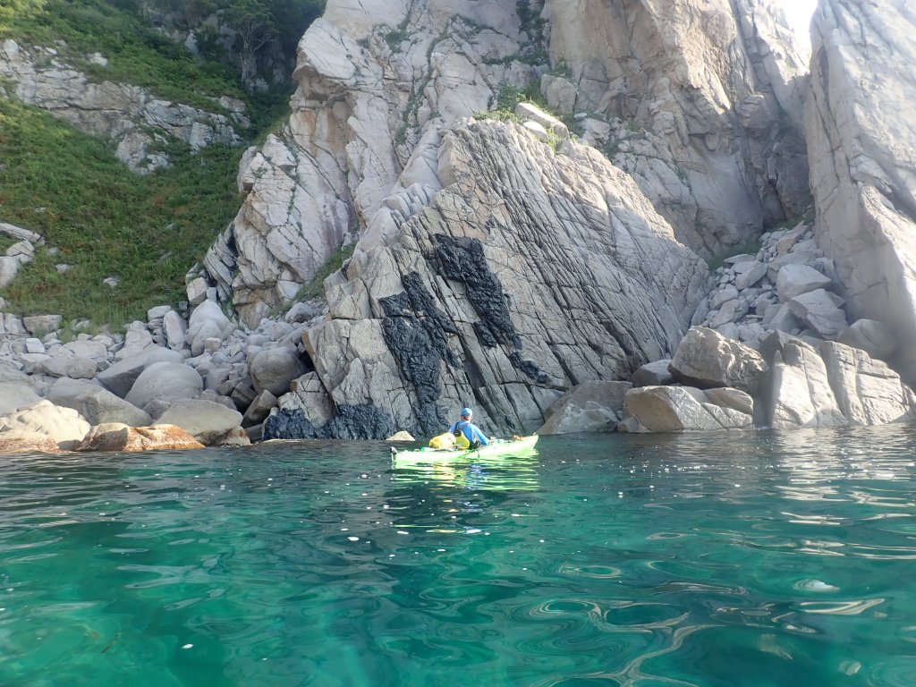 Тут мне приходит мысль, что как минимум некоторые линейные маршруты на каяке надо проходить в оба конца. В 2018 на этом участке мы шли в сильный встречный ветер, усталые после 30 км, и все усилия и внимание были направлены чтобы дойти до следующей бухты. Солнце тогда уже ушло на запад, за горы, и освещение было совсем другое. Сейчас же мы идем вдоль утесов, залитых солнцем, полные сил, и восприятие совершенно другое. Такое ощущение у меня оставалось практически на всем протяжении той части этого похода, которую мы прошли 3-мя годами ранее.