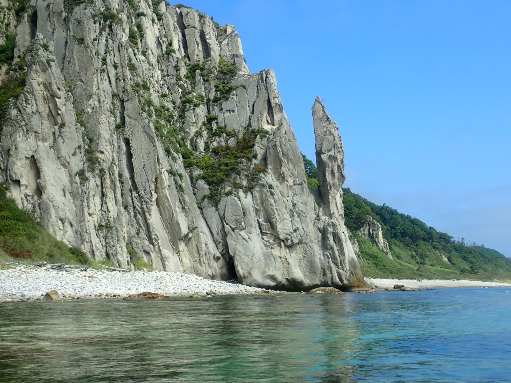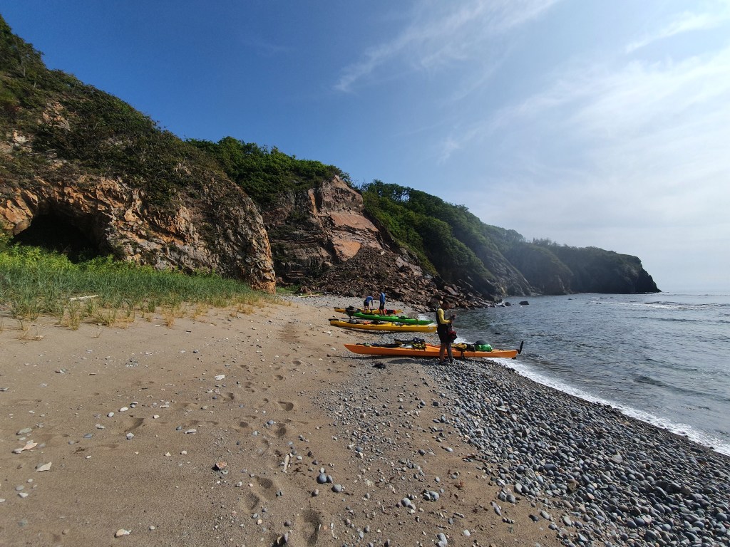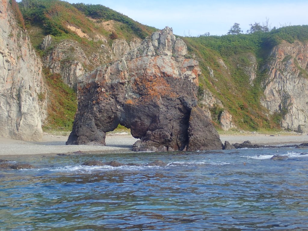 Режем бухту Моряка-Рыболова и идем вдоль берега. Очень жарко, а усыпанный китайскими поплавками берег очень напоминает сахалинский – песчаный пляж, клиф, и потом полка плато с сопками. Пройдя около 15 км группа замедлилась, еще больше чувствуется усталость от трех предыдущих дней, и в конечном итоге мы не доходим до бухты Ландышевой, около 2 км, а высаживаемся за каменным мыском с огромной пещерой на берегу, и устраиваем перекур. Ветра по-прежнему нет, я решаю немного поснимать, и отпускаю ребят вперед.