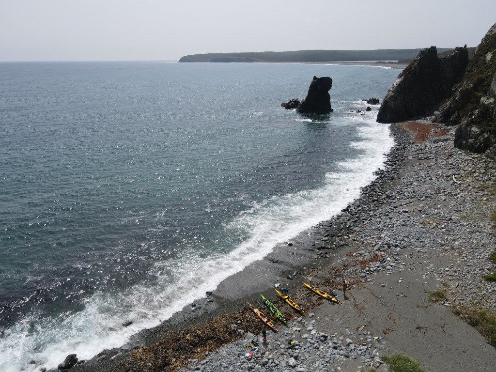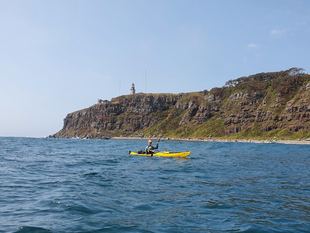 Здесь, с южной стороны – самые большие волны, приходится обходить мыс сильно мористее. С удовольствием рассматриваем маяк, он очень живописный, хоть и закрытый, над высокими скалами – променад, прогулочная зона. Красивейшее место. Накат также пресекает какую-либо возможность высадиться и посмотреть на него, и на обед мы уходим в бухту севернее, прямо рядом с мысом Кёкурным. В 2018 мы здесь ночевали, и когда я высаживаюсь и тут в отличие от многих других мест совсем ничего не изменилось. Мне даже показалось, что в кустах лежат те же сапоги, что и 3 года назад, когда мы здесь были.