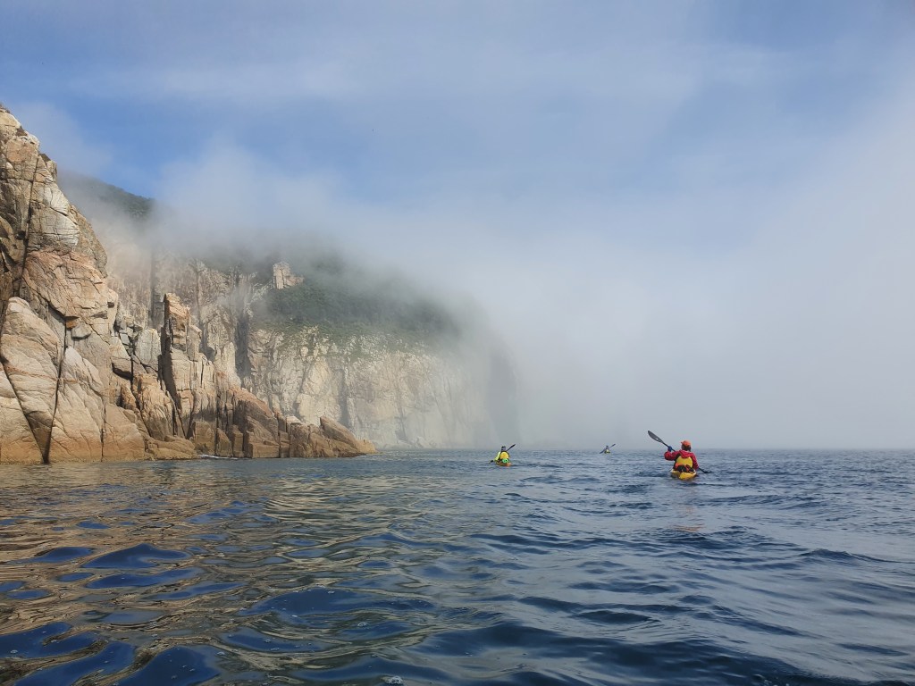 Гребем в тумане, бухту Маневского режем вообще по приборам, но переход совсем короткий, около 3 км и мы уже снова у берега. Так как в тумане идем все близко, всматриваюсь в лица ребят. Что они чувствуют сейчас, не жаль ли им, что все сейчас закончится.