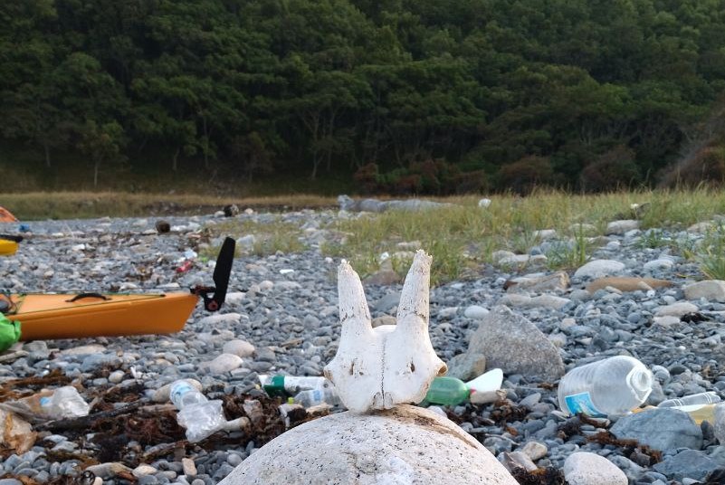 Собравшись в кучу, не смотря на усталость, решаем что надо идти дальше, и высаживаться там, где будет хоть малейшая возможность спрятаться от волны. Или хотя бы чтобы был пологий песчаный участок. Гребем несколько километров, и наконец высаживаемся в небольшой бухте на побережье. Здесь крошечная линия, буквально 3 метра пологого песка, и волны ломаются немного реже чем везде. Измотанные выпрыгиваем. Место живописное, хотя очень большое количество мусора и следов человеческого присутствия. А еще прямо на камне стоит козлиный череп.