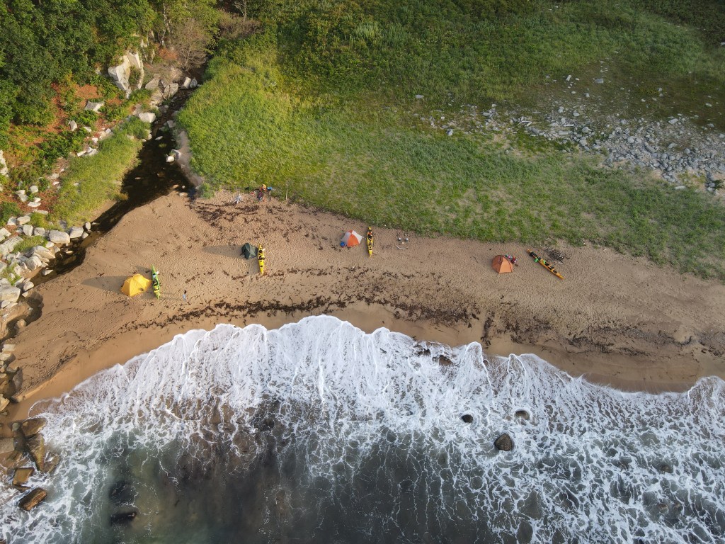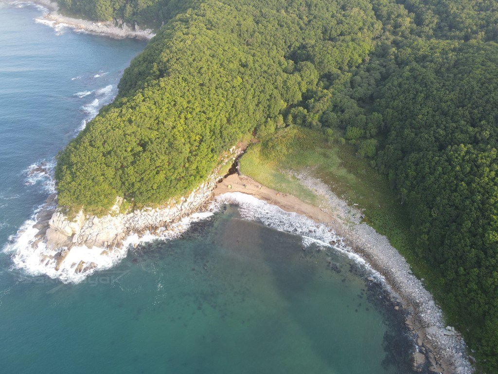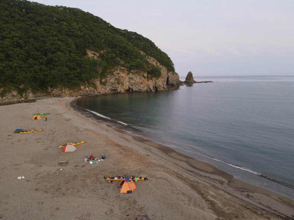 Так как мы отсыпаемся, утро медленное, успеваю полетать и поснимать бухту. Ночью пришел большой свелл, море вдоль побережья на север в пене, это значит ее очень много от разбивающихся волн. Во время завтрака Артем озвучивает мысль о том, что очень может быть, что он сойдет в Ольге, так как руль восстановить не удается, а лодка безбожно подтекает. Идти сидя в воде, даже в приморье очень дискомфортно. Говорит, что решит к вечеру.