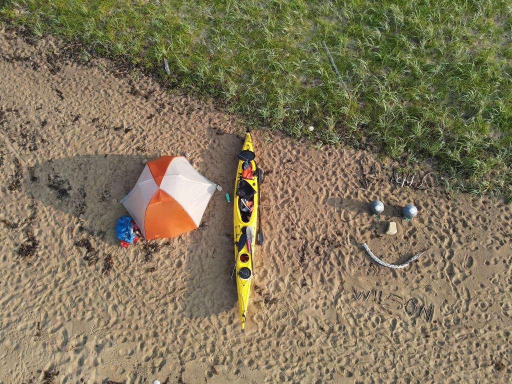 Никита ушел в лес «по грибы», а в результате нашел, угадайте с трех раз… скелет какого-то зверя. Я сходил на север бухты и обнаружил очень интересный артефакт, абсолютно круглый камень, похожий на огромный жернов. Вообще, настроение хорошее, а от удаления от цивилизации появилась потребность креативного выражение в искусстве. В результате, рядом с моей палаткой возникает композиция WILSON. Вечером ветер стихает, и мы, вымотанные ложимся спать. 214.2 км на одометре очень радуют, хоть и даются они совсем нелегко.