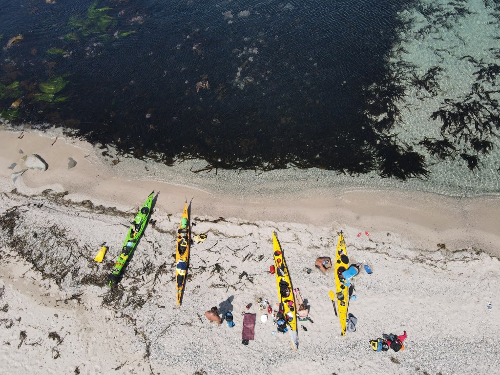 Перемещения у нас довольно-таки интересные. Когда мы нагребаем километры без достопримечательностей, мы то идем группой, то разделяемся, то делимся на пары или тройки. Общаемся и перетусовываемся снова и снова. Приходит мысль о том, что в такой момент каякинг напоминает коктейльную вечеринку, где люди произвольно перемещаются и общаются в одном помещении, примерно также. Только вот одеты мы слегка по-другому, а вместо бокалов с мартини в руках у нас весла. Озвучил это группе, на что все ухмыльнулись, но особо тему не развивали. Похоже мы уже устали, и просто хотим догрести до конца дня.