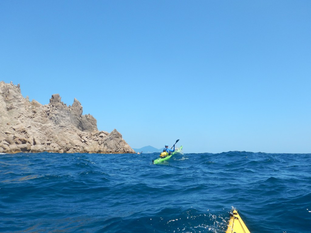 Ветер раздуло попутный, юго-западный, волна довольно-таки сильная, поэтому хотя и несет, ухожу максимально к берегу, так как в 300 метрах волны постоянно бьют в спину сзади. Ребята же идут мористее. Прямо перед бухтой Маневского встречаемся, тут есть еще одна бухта, и мы решаем куда выскочить. В конечном итоге выбираем вторую бухту перед мысом Средняя Скала.