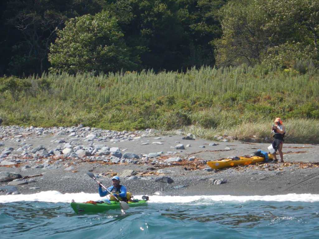 До нашей последней ночевки перед Ольгой не больше 8 км, поэтому обед растягивается почти на 2 часа. Опять снимаю ребят на выходе, неспешно собираюсь и выхожу. Выход получился эпичным, хотя пляжик самый простой. На выходе теряю бутылку с водой, это критично. Ищу ее у берега, и не вижу, что приходит большой сет волн. Первая из них ломается прямо передо мной, цепляюсь за нее и меня почти выкидывает на берег, а другие две пытаются добить. Но нет, обошлось. Можно сказать, что принял холодный душ.