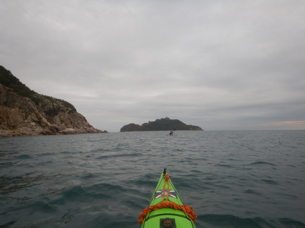 Сразу за мысом покатили волны, хотя участок не самый сложный – он смотрит на юг, и северо-восточная волна приходит по косой. В какой-то момент нас нагоняет прогулочный катер, в котором две тетушки на корме держатся изо всех сил за поручни. Мы же медленно, но верно ползем. Катер через пару минут заходит за мыс, исчезает, и через 5 минут идет обратно. Явно ему не понравилось что там происходит, а тетушки, я заметил, уже сидят в рубке. А еще неожиданно из-за мыса, появляется внушительных размеров контейнеровоз. На секунду мне вспомнились мои собственные вылазки в Сингапуре, где это случалось каждый раз. Погадав, что он тут делает, идем дальше.