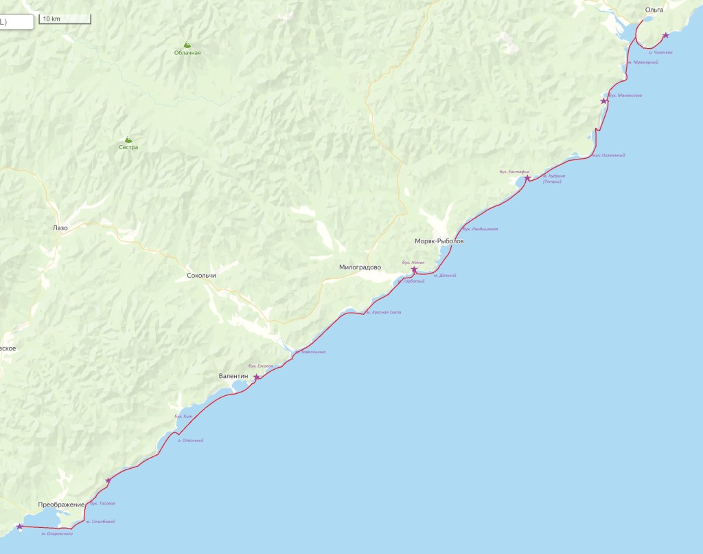 Мысов на самом деле три: Овсянкина с запада, по центру Оларовского и дальше, северо-восточнее – Столбовой. В основном это высокие скалы с живописными утесами кёкурами, с западной стороны неглубокая бухта с пляжем и строениями, но в целом это очень сложный участок длинной около 6 км до Тасовой. В 2018 году, нам давали плохой прогноз в тот день когда мы их проходили, и мы вышли в 7 утра, чтобы их проскочить.