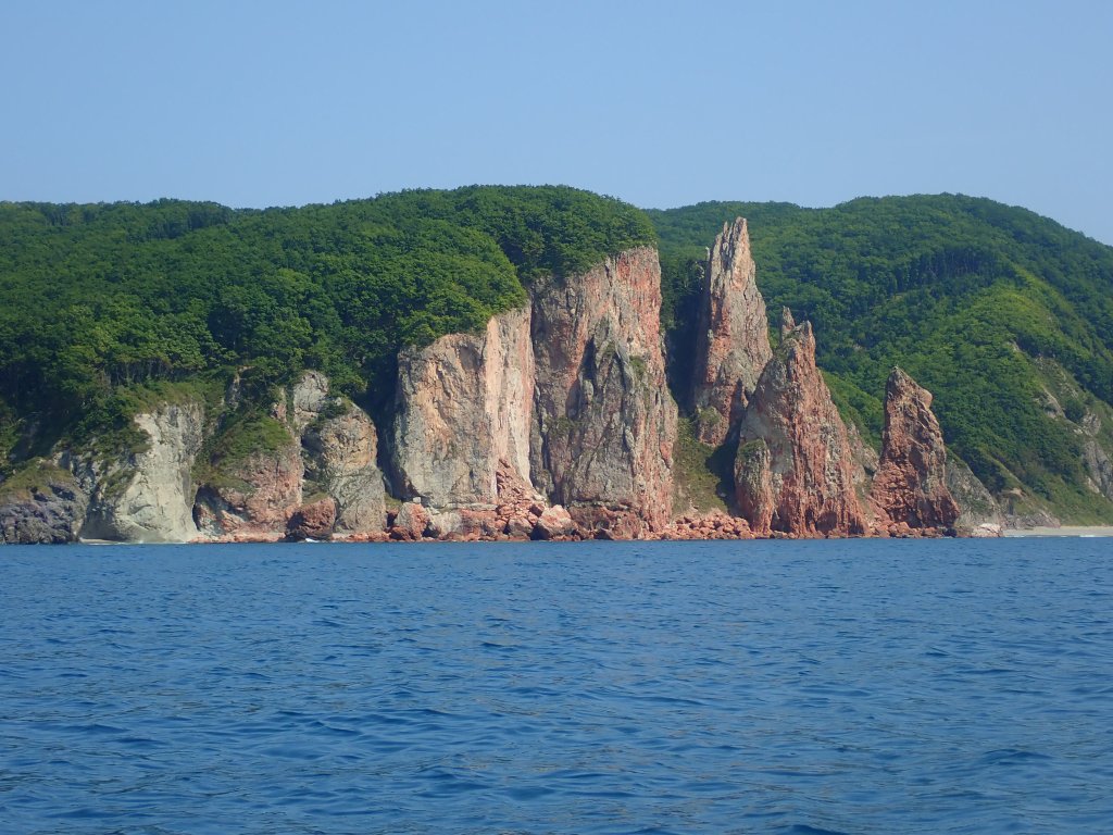 Море стихло примерно на половину, приходит зыбь 0.7 м, но совсем нет ветра. Все карты нам в руки в общем. После небольшой пробуксовки с дежурством, выходим и идем вдоль берега. Побережье здесь монументально. Хотя совсем вплотную из-за зыби подойти не можем, идем довольно-таки близко. Огромные каменные утесы с елями прямо над нами вызывают одновременно ощущение масштаба и трепета, перед мощью дикой природы.